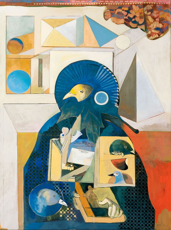 85. aukce, číslo katalogu 124 Divácky působivá, okouzlující práce prezentuje dílo velice zajímavého a mezinárodně ceněného autora Andreho Nemese. Tento pozoruhodný umělec byl během války kvůli svému maďarsko-židovskému původu nucen opustit Československo a zůstat ve Skandinávii. Prvotní malířův zájem o figuru zůstal v jeho tvorbě hluboce zakořeněný, ovšem během války začaly Nemesovy postavy získávat geometrizující formu. V české metafyzické malbě to znamenalo nový rozměr, autorova imaginace se přitom stávala čím dál tím naléhavější a zrcadlila dobovou tragédii i hledání tradičních hodnot. Postupně se v jeho obrazech začala odrážet i inspirace koláží a malířský experiment postupně vyvrcholil ve velkolepých malbách, jež jsou námětově složeny z nesourodých prvků. V nevšedním plátně Pták před námi Nemes rozehrává podivuhodnou scénu, jejímž ústředním motivem je modrá silueta vrcholící v hlavě ptáka. Geometrizující prvky v pozadí jsou volně poskládány bez zjevné souvislosti a celý výjev je završen snad fragmentem tkané draperie a maďarským či blízkovýchodním tradičním vzorem. Celá malba je postavena právě na jakési surrealistické kolážové metodě a je nádhernou ukázkou tvorby tohoto světově ceněného umělce. Dílo bylo prezentováno na výstavě Umění 20. století v Galerii Moderna (25. 5. – 14. 6. 2020). Při konzultacích posouzeno prof. J. Zeminou a PhDr. R. Michalovou, Ph.D. Přiložena odborná expertiza PhDr. K. Srpa (cit.: „[…] Jeden ze závěrečných obrazů Endre Nemese, který v roce 1985 zemřel, představuje syntézu jeho celoživotního úsilí. Když jej pozorujeme vybaví se nám většina úseků jeho bohatého díla, připomeneme si jeho jednotu a vnitřní provázanost, vzpomeneme si na Nemesovy metafyzické obrazy z konce třicátých let, jimiž se proslavil krátce před svou emigrací v Československu a uvědomíme si, že kořeny jeho díla spadají do linie, která byla v českém malířství velmi silná, vycházející z návaznosti na Giorgio de Chirica a na Maxe Ernsta. […]“).