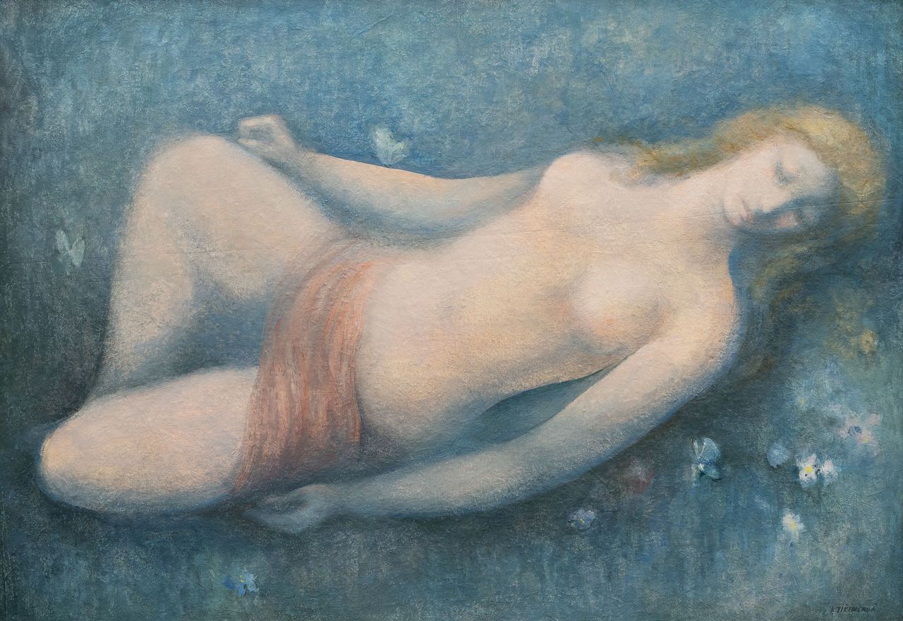 Melancholické, malířsky senzitivně ztvárněné dílo je vynikající ukázkou poetického způsobu malby přední české ilustrátorky druhé poloviny 20. století Ludmily Jiřincové. Křehkou povahu první dámy české grafiky částečně zformovala realita tragických důsledků druhé světové války i zděděný talent po jejím prastrýci Ferdinandu Engelmüllerovi, významném českém krajináři. Ve volné tvorbě dokázala malířka s bravurní pečlivostí využít možností barevných valérů a vetknout každému dílu neobyčejnou jemnost projevu, až se některé její obrazy zdají být spíše výtvarnou básní, která dává nahlédnout do autorčina nitra. V minuciézně odstíněných růžových tónech něžně podaného obrazu se doslova vznáší na snové, v zelenošedých tónech laděné louce dívka se zavřenýma očima, v okamžiku meditace či snad spánku. Dílu, prodchnutému neobyčejnou poetickou něhou, vtiskla Jiřincová nejlepší znaky svého talentu a vnitřního založení, půvabnou dějovost i decentní erotičnost. Neutrální pozadí dodává celému výjevu měkký sametový výraz a vyzdvihuje ženské tělo do středu divákovy pozornosti s důmyslnou prezentací ženské krásy. Při konzultacích posouzeno prof. J. Zeminou a PhDr. R. Michalovou, Ph.D