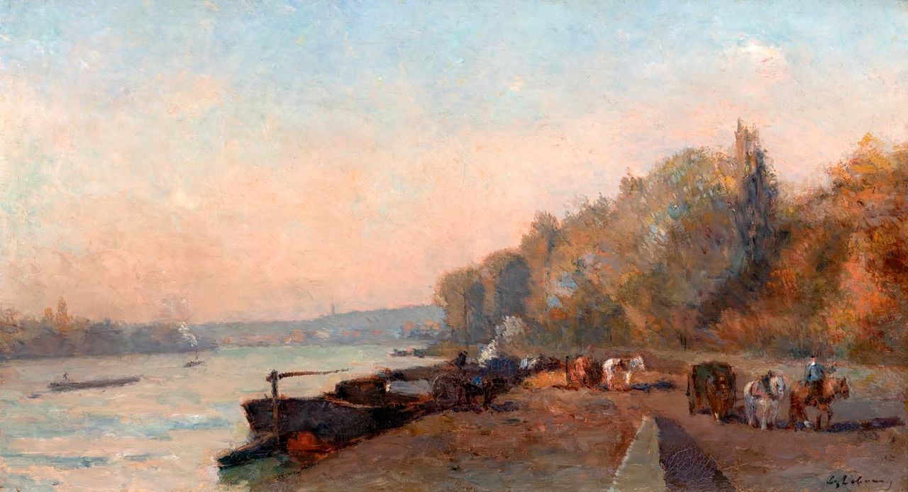 85. aukce, číslo katalogu 88 Na českém trhu vzácně se objevující dílo francouzského impresionisty a postimpresionisty, čelního představitele l‘École de Rouen, jenž se přátelil a vystavoval s předními představiteli soudobých progresivních uměleckých směrů, je pojednáno jeho dobře poznatelným rukopisem charakteristickým nebývale senzitivním vnímáním světla a jeho proměn v konkrétních denních dobách. To vše pod atmosférickým závojem dýmu z parníků a fascinací efemérním plynutím okolního dění. Představovaná práce svědčí o suverénnosti autora, pevnosti zažité formy a bravurní malířské zkratce. Určujícím prvkem pro celkový umělecký výraz je i sugestivní podání podvečerní atmosféry, která je společně s celkovým koloristickým konceptem brilantně laděná do teplých tónů večerního světla. Nápadné afinity s dílem Antonína Chittussiho, jenž se čilým ruchem francouzských řek také opakovaně zabýval, jsou nejspíše nejen dobovým fenoménem, ale souvisejí patrně s konkrétními inspiracemi a společnými lokacemi, které oba umělci prokazatelně navštěvovali. Při konzultacích posouzeno prof. PhDr. R. Prahlem, CSc., a doc. PhDr. M. Theinhardt. Přiložena odborná expertiza PhDr. Š. Leubnerové.