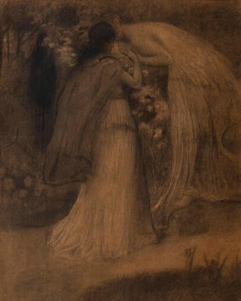 85. aukce, číslo katalogu 108 Tuto výjimečnou velkoformátovou kresbu Jana Preislera, jednoho z přímých formovatelů českého moderního umění po roce 1900, lze označit za skutečný objev a nečekané doplnění tvůrčí mozaiky dláždící cestu ke známé olejomalbě s názvem Polibek, zdobící sbírky Národní galerie, jež je pokládána za první skutečně významnou juvenilii v autorově portfoliu volné tvorby. Ta se vyrovnávala s dobově silným proudem alegorického myšlení, které ovšem transformovala v individuální uměleckou výpověď, jejíž zdroje byly otevřeny především literatuře a poezii. Tématem představované práce, jež je variantou kompozice označované autorem původně pouze jako Karton, se Preisler zabýval záhy po dokončení studií v roce 1895. Jedná se o poetickou, až mystickou scénu odehrávající se v zákoutí parku či zahrady. Jejími hlavními protagonisty jsou „éterický ženský zjev“, k němuž se sklání andělská bytost personifikující pocity a představy ženy vyvolané přičichnutím k rozkvetlému keři. Výtvarnými prostředky se zde tvůrce velmi poeticky pokusil vyjádřit a evokovat „omamnou vůni jako podnět ke spirituálnímu zážitku“. Navzdory zcela novátorské ikonografii čerpal nejen z dobově oblíbeného motivu ženy v květech, ale kupř. i z motivu Psýché políbené Amorem, což dodává výjevu další typicky dobové konotace. Zvolená, dalo by se říci malířská technika roztíraného uhlu, rozostřujícího obrysy, zde navíc zcela odpovídá Preislerově snaze o nehmotné působení scény. Na rubové straně se nachází pozůstalostní razítko a označení z výstavy pořádané SVU Mánes (Posmrtná výstava V. H. Brunnera a vzpomínková výstava Jana Preislera, Praha, Obecní dům, 1928, kat. č. 33b). Prezentováno v původní vkusné adjustaci. Při konzultacích posouzeno prof. J. Zeminou a prof. PhDr. R. Prahlem, CSc. Přiložena odborná expertiza PhDr. K. Srpa.