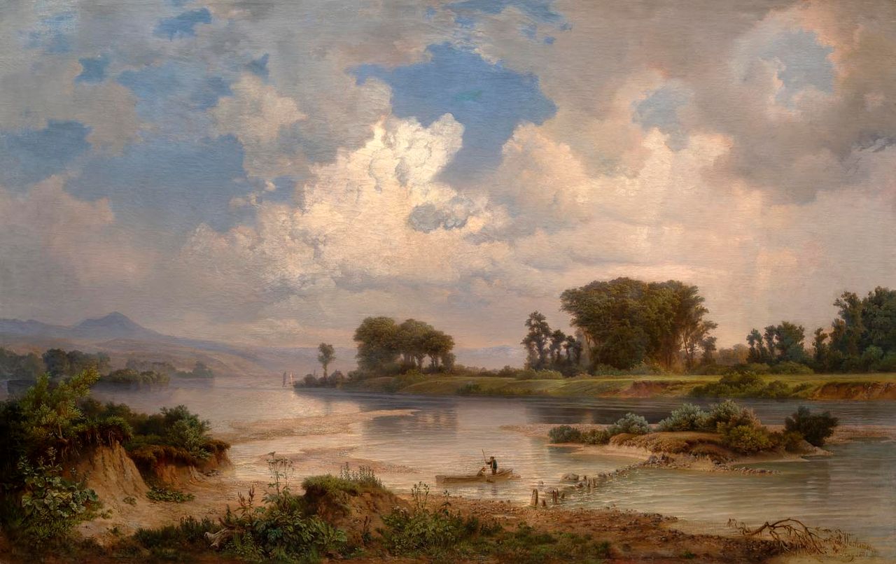 85. aukce, číslo katalogu 121 Bedřich Wachsmann byl velice nadaným a všestranným umělcem, který obecně v umění kreslířském obsáhl celý komplex možných úkolů. Byl totiž nejen krajinářem, ale i zdatným figuralistou, grafikem, restaurátorem, návrhářem liturgických předmětů či dokonce architektem, pedagogem a sběratelem. K tomu všemu měl také důkladnou průpravu z lipské a drážďanské Akademie a zkušenosti z Innsbrucku a Mnichova, které plně zhodnotil po svém usazení v Praze roku 1854. Wachsmann byl zároveň spisovatelem, jenž vydal teoretický návod pro krajinářství a sepsal též celou řadu cestopisných pojednání. A právě vášeň pro cestopisy a dokonalá teoretická znalost krajinářského oboru mu byly základem pro představované dílo, které je nejen dokonale perspektivně konstruováno, ale působí především jako malovaný cestopis vykreslující každý detail, říční zákrutu, mělčinu a siluetu kopcovité krajiny, jež dodnes znalcům tamního kraje napoví, že byl obraz namalován nedaleko hory Sedlo, druhé nejvyšší hory Českého středohoří, pravděpodobně poblíž obce Počaply. Roku 1861 prezentoval Wachsmann na výstavě Krasoumné jednoty dílo s názvem Labská krajina u Litoměřic (P. Toman: Nový slovník československých výtvarných umělců, II. L–Ž, Ostrava, 1993, str. 682–683). Vzhledem ke galerijnímu formátu i datu vzniku představovaného plátna lze teoreticky uvažovat o jeho souvislosti právě s Labskou krajinou u Litoměřic. Při konzultacích posouzeno prof. PhDr. R. Prahlem, CSc., a PhDr. Š. Leubnerovou. Přiložena odborná expertiza Mgr. P. Kubíka.