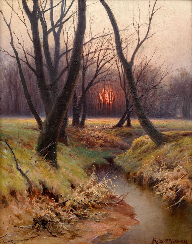 Představovaná práce je ukázkou díla českého malíře a významného ilustrátora Karla Liebschera, původně vystudovaného technika a staršího bratra Adolfa Liebschera. Znám je hlavně pro topograficky přesné a výstižné „obrazové průvodce“ krajinou českého království. Jeho Západ slunce na podzim však reprezentuje další polohu jeho tvorby, a to spíše romantizující pohled na krajinu v jejím krajním stavu, v tomto případě ve chvíli, kdy se abnormálně působící sluneční kotouč blíží v podvečer k horizontu. Jedná se o dílo vysoké sběratelské i estetické přitažlivosti. Při konzultacích posouzeno prof. R. Prahlem, CSc., a PhDr. Š. Leubnerovou.