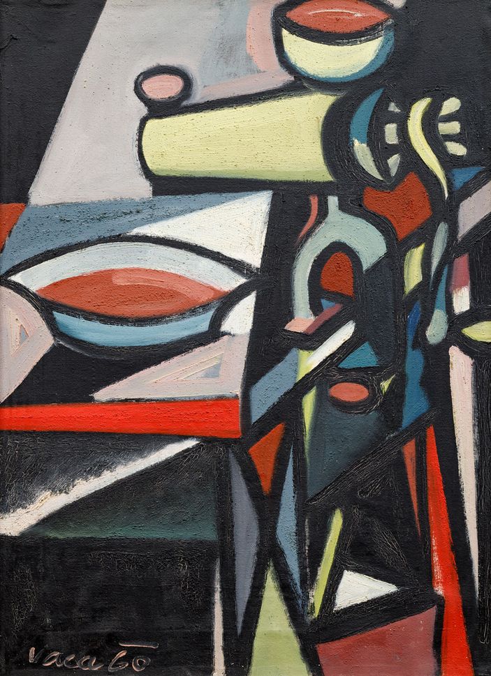 88. aukce, číslo katalogu 78 Tato reprezentativní, vysoce kultivovaná Vacova práce z vrcholné doby počátku 60. let výborně reflektuje nejen Fillovu školu a skupinu Trasa 54, ale i přesahy k evropským vzorům. Jeden z nejlepších Fillových žáků se zde prezentuje výbornou geometrizující prací, barevně odvážně laděnou, vynikající zejména v typickém použití písků v olejové barvě a černé kontuře, která se stala průvodcem jeho kolorismu. Unikátní osobitý olej, lehce inspirovaný i Fernandem Légerem, jehož divácký efekt akcentuje rytmický rozvrh kompozice ovládnuté zvlněnými liniemi a zaoblenými tvary, byl vystaven na malířových výstavách v Oblastní galerii Vysočiny v Jihlavě (12. 5. – 28. 6. 2005), v Galerii moderního umění v Roudnici nad Labem (10. 3. – 1. 5. 2005) a v Galerii KODL (červen–srpen 2004). Získáno z pozůstalosti autora. Při konzultacích posouzeno prof. J. Zeminou a PhDr. R. Michalovou, Ph.D.