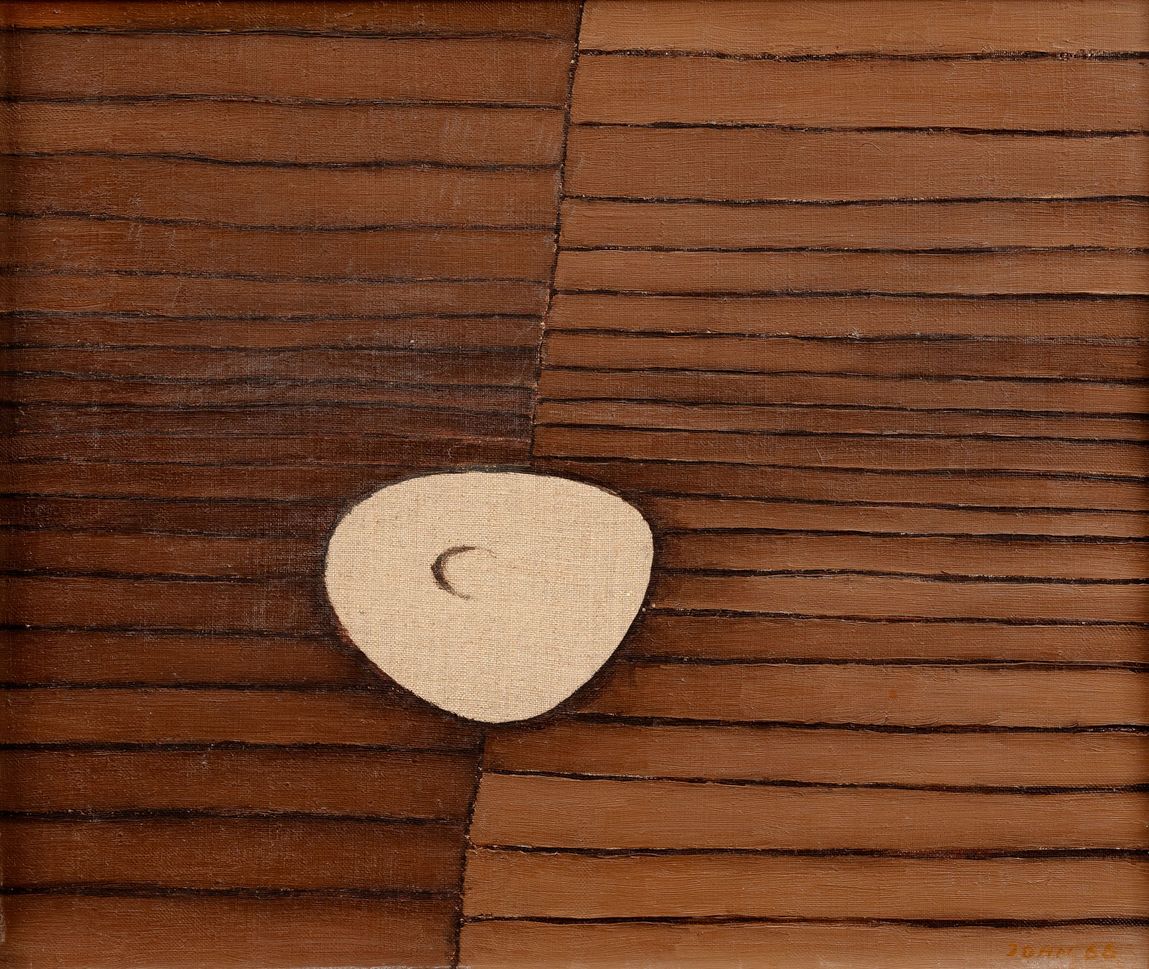 84. aukce, číslo katalogu 65 Představovaná práce je raritní ukázkou tvorby malíře, grafika, ilustrátora a člena skupiny UB12 Jiřího Johna. Přestože se tento mimořádný talent nijak aktivně neúčastnil spolkového života, byl všeobecně uznáván pro zvláštní kvality svého umění. Zvolené motivy zobrazoval v příjemně tlumeném koloritu a jemném rukopise s nebývalou bezprostředností a přesvědčivostí, ze které je přímo patrná umělcova lyrická duše a nevšední blízkost k metafyzice hmoty. Není proto divu, že Johnova tvorba bývá srovnávána s levitujícími krajinami Josefa Šímy či plátny Václava Boštíka. Obraz zachycující tvar jakéhosi oblého jádra či vejce na pozadí hnědých vrstev, snad brázd v hliněném poli, vyvedených v geometricky stylizovaném duchu, je dokonalou ukázkou jeho klidného a vyrovnaného přístupu ke kompozici. Stává se tak dílem, jež přetváří přírodu ve své radikalitě i něžnosti do nenásilných abstraktních forem. Při konzultacích posouzeno prof. J. Zeminou a PhDr. K. Srpem. Přiložena odborná expertiza PhDr. J. Machalického.
