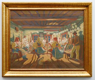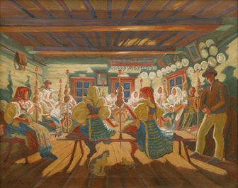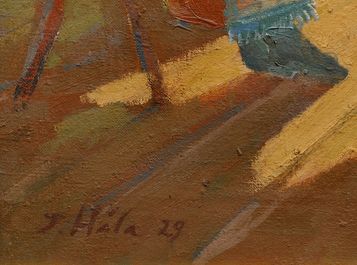 Jan Hála pocházel sice z jihočeské Blatné a výtvarné vzdělání získal nejprve pod vedením Ferdinanda Engelmüllera a následně v ateliéru Maxmiliána Pirnera na pražské Akademii, jeho život i dílo jsou však neodmyslitelně spjaty především se Slovenskem a životem pod Tatrami. Byla to spíše náhoda, která ho roku 1923 přivedla do Važce, vesnice, která se mu zalíbila natolik, že se zde následně trvale usadil a věnoval se plně studiu tamního kraje a života jeho obyvatel. Jak sám napsal, zaujaly ho na první pohled „…skupiny Važťanů – dlouhovlasí staří chlapi pod širokými klobouky, ženy v bělostných bohatých rukávcích a pestrých šátcích. Všude plno dětí, všude zvučel, kypěl život a hýřily barvy.“ Maloval vše, z čeho se skládal tamní život – práci doma i na poli, všední i sváteční den, jaro, léto, podzim i zimu. Jeho nadšení bylo neutuchající a navzdory těžkým podmínkám, kdy mnohdy neměl na základní malířské potřeby a mráz mu zalézal do dřevěnice mnohými škvírami, pokračoval v práci médiem kresby a studoval vše: lidi, zvířata, nářadí či domy. Splynutí s místním prostředím pro něj bylo velmi přirozené; zasloužil se také o propagaci Važce, který se stal ústředním bodem jeho knížek a článků, byl inspirací pro ilustrace čítanek a slabikářů. V jarních, letních a podzimních měsících, jak počasí dovolilo, zachycoval Hála přírodu a obyvatele Važce v rytmu a proměnách, které přinášelo střídání ročních období. Zimní měsíce byly zase příležitostí studovat nejen zasněžené stráně a zamrzlé potoky, ale i pestrobarevný život v chalupách, kde maloval svatební veselí, draní peří nebo předení. Právě předení, slovensky priadky, je námětem představovaného obrazu – jedná se o tradiční společenský fenomén, jenž má mj. velkou hodnotu jak z hlediska folklorního, tak i antropologického a jeho kořeny sahají minimálně do 16. století. Ženy a dívky se od listopadu do jara scházely, aby společně předly. Rozdělené měly nejen předení samotné, ale i nutné náležitosti spojené s provozem celé činnosti – společně se kupř. skládaly na petrolej a bylo zvykem, aby každá účastnice přinesla s sebou také něco na otop. V některé přesně určené dny, jak zde také Hála zachytil, byli, vedle neodmyslitelných hrajících si kočiček zcela v popředí, přítomni i nezadaní mládenci. Předení tak bylo v tyto dny spojené i s tancem a námluvami. Hálovy Priadky lze bez nadsázky označit za jedno z nejvýznamnějších autorových děl z važeckého období, která se dosud na trhu s uměním objevila. Po všech stránkách, tedy volbou tématu, barevností i technickým provedením, tak reprezentuje nejoceňovanější polohu autorovy tvorby. Při konzultacích posouzeno prof. J. Zeminou a J. M. Hálou, autorovým synem, jehož potvrzení autenticity je také přiloženo. Přiložena odborná expertiza Ing. M. Hodoše.