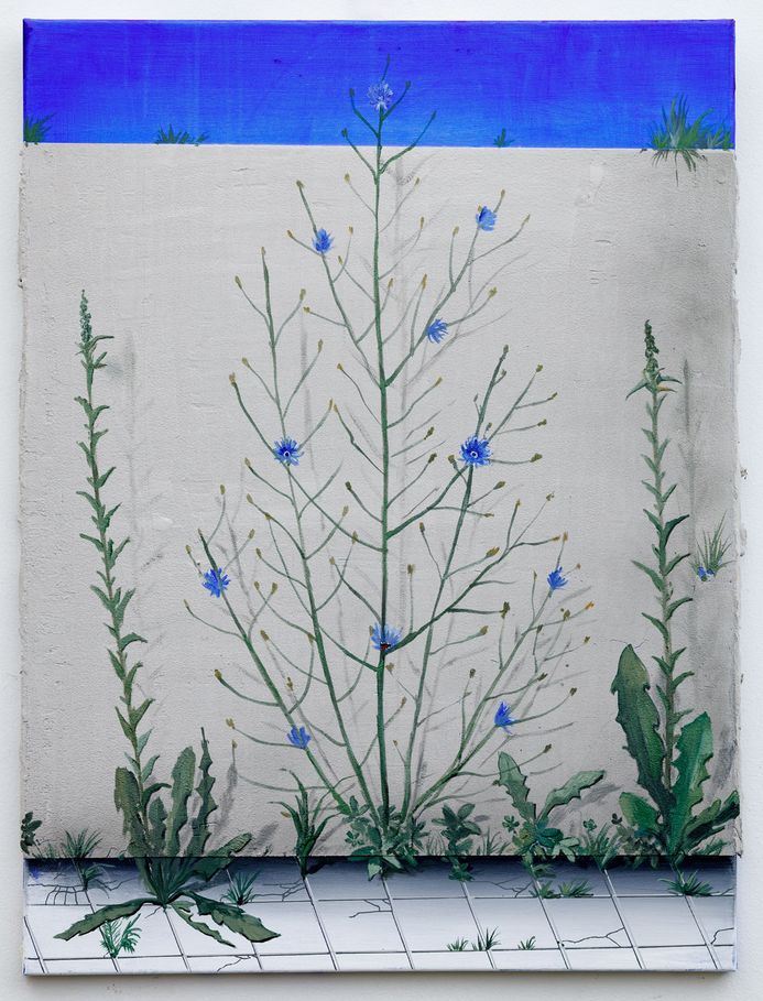 Ve své recentní tvorbě Ondřej Basjuk reflektuje otázky spojené se zánikem světa a kontempluje nad tím, co po nás jako lidstvu zůstane. Vědom si sociálně-politických a klimatických nesnází, kterým čelíme, sahá po anti-utopických, fiktivních a lehce ironizujících způsobech sebevyjádření. Jeho plátna typicky chladné barevnosti s častými prvky v odstínech šedé se stávají postapokalyptickými krajinami, v nichž autor kombinuje plošnost s perspektivně a plasticky vyvedenými detaily. V předloženém díle se nám jako fantom zjevuje čekanka obecná v rozpuku, deroucí se ze spár chodníku a rostoucí podél zdi, jako by za ni chtěla nakouknout. Čekanka může pro svou vytrvalost a schopnost odolat jakýmkoliv podmínkám v divákovi vzbuzovat mnoho otázek o svém symbolickém významu. Je snad betonové městské zákoutí metaforou pro lidskou existenci, skrz niž si příroda cestu vždycky najde? Dílo pochází přímo z autorova ateliéru.