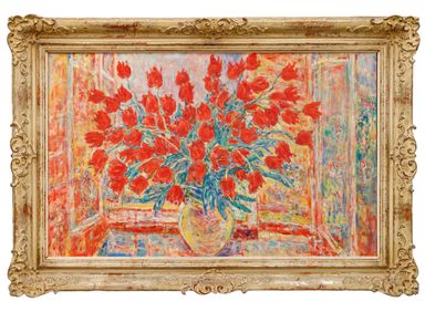 Velice zdařilá práce v autorově oblíbeném šířkovém formátu představuje tvorbu moravského rodáka Bohumíra Dvorského, jenž získal umělecké školení v krajinářské speciálce Otakara Nejedlého. Jeho malby zejména z období pobytu na Hané, kde zakotvil po druhé světové válce, překypují barevností a živostí. V předkládaném obraze před nás Dvorský staví klasické květinové zátiší, podané ale s takovou energií a vitalitou, že nás doslova pohlcuje. Teplá letní atmosféra se odráží i na stěnách a stole interiéru a je nádhernou ukázkou autorova impresivního malířského rukopisu. Při konzultacích posouzeno prof. J. Zeminou a PhDr. R. Michalovou, Ph.D.