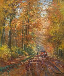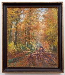 Vyvolávací cena: 130 000 Kč Dosažená cena: 300 000 KčPředstavované plátno, prezentující svého autora ve zralé fázi konce dvacátých let 20. století, hovoří o Lolkovi jako o tvůrci bytostně spjatém s přírodou, lesem a životem v něm – dříve než se plně oddal malbě, vystudoval v Písku lesnickou školu, a obrazy s dominantním motivem lesní zvěře mnohdy také bývají vnímány jako prvořadá synonyma pro jeho tvorbu. Konkrétně zde je zobrazena široká a přímá lesní cesta procházející tunelem listoví klenoucím se nad volským potahem, mířícím kamsi za prací, nebo naopak domů. Zvolený kolorit i celková světelná režie a z ní vyplývající nálada přenášejí diváka do doby babího léta a dávají mu takřka pocítit vůni tlejícího listí i posledních hřejivých doteků slunce před blížícím se zimním obdobím. Lolek tu zůstal po všech stránkách věrný východiskům, jimiž byla jeho krajinářská tvorba definována. Po tematické stránce si nelze nevšimnout inspirace lesními cestami a úvozy jeho generačních kolegů, spolužáků z ateliéru Julia Mařáka na pražské Akademii – připomeňme v prvé řadě Antonína Slavíčka a Otakara Lebedu, ale nejen je. Jeho rukopis je složen z jednotlivých dělených ploch, někdy spíše bodů, někdy spíše tahů, jež v impresionistické tradici stmeluje zářivé světlo a v oku diváka vytváří mimořádně přitažlivý vizuální a estetický zážitek. Bez nadsázky lze tuto práci zařadit mezi nejlepší příklady Lolkova zralého tvůrčího vzmachu, které se dosud na trhu s uměním objevily – prokazuje tak stabilně vysokou úroveň a životaschopnost jeho výtvarného projevu. Při konzultacích posouzeno prof. J. Zeminou a Mgr. M. Dospělem, Ph.D. Přiložena odborná expertiza Mgr. P. Kubíka.