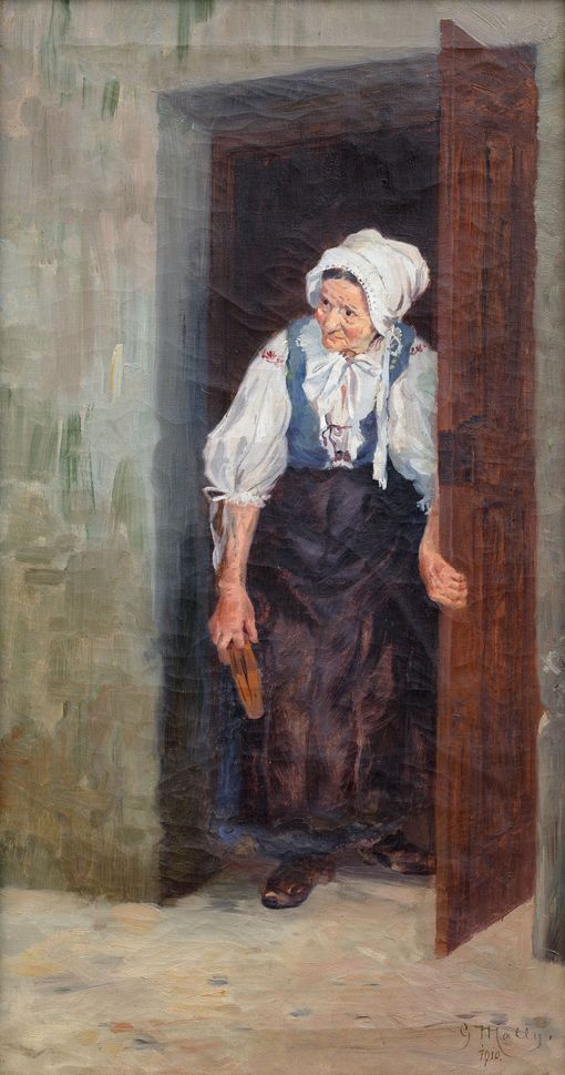 Vyvolávací cena: 140 000 Kč Dosažená cena: 180 000 KčTato poetická malba je dílem průkopníka slovenského moderního umění Gustáva Mallého, který se účastnil povznesení společenského a kulturního ducha založením Spolku slovenských umělců a Umělecké besedy slovenské. Jeho dílo v sobě spojuje vynikající štětcovou bravuru s unikátní dokumentární hodnotou díky znalostem a lásce k rodnému kraji a lidem. Moderní výraz, získaný díky školení v Praze a Drážďanech, zhodnotil ve své tvorbě, ze které nikdy nevymizela lidská figura. Právě na ní se projevoval běh života, neboť člověk spjatý s vírou a pravidelným životním rytmem byl závislý na přírodních cyklech. Celkovou dynamiku díla umocňuje uvolněný impresionistický tón barevného chvění ve spojení s expresivním výrazem propůjčeným zobrazovanému motivu. Postava staré ženy, oblečená do lidového slovenského kroje, vyjadřuje archetyp starostlivé babičky, jejíž láska a péče je konejšivou vidinou každé lidské bytosti. Při konzultacích posouzeno prof. J. Zeminou a PhDr. K. Bajcurovou, CSc. Přiložena odborná expertiza Ing. M. Hodoše.