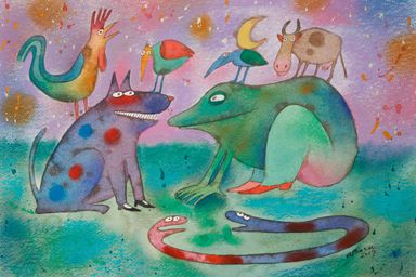 Toto hravé a fantaskní dílo je typickou ukázkou pozdní tvorby Adolfa Borna, jednoho z nejvýznamnějších českých ilustrátorů a výtvarníků 20. století. Sněm zvířat představuje Bornův charakteristický styl kombinující humor, nadsázku a surrealistické prvky. Kompozici tvoří skupina stylizovaných zvířat. Na zádech velkého modrofialového psa v lakýrkách a zelené žáby v červených střevíčcích drží rovnováhu zvířata namalovaná v menším měřítku představující kohoutka, ptáčky a kravičku. Zvířata jsou zobrazena v Bornově typickém karikaturním stylu s důrazem na výrazné barvy a zjednodušené tvary. Možná při sněmu vybírají mezi sebou krále, jak o tom psal Ezop ve svých bajkách. Born zde mistrně využívá techniku rozmývaného pastelu, která dodává zobrazené scéně lehkost a průsvitnost. Pastelové tóny pozadí kontrastují s jasnými barvami zvířecích postav. Celková atmosféra je snová a poetická, evokující dětskou představivost a svět pohádek. Sněm zvířat odráží Bornovu celoživotní fascinaci zvířecí říší a zve diváka do světa fantazie, kde se hranice mezi realitou a snem stírají a humor a nadsázka jsou prostředky k oslavě lidského a zvířecího světa. Práce je výbornou ukázkou umělcova nezaměnitelného rukopisu, který si získal oblibu jak u dětských, tak u dospělých diváků. Při konzultacích posouzeno prof. J. Zeminou a E. Bornovou, autorovou dcerou. Přiložena odborná expertiza PhDr. J. Machalického.