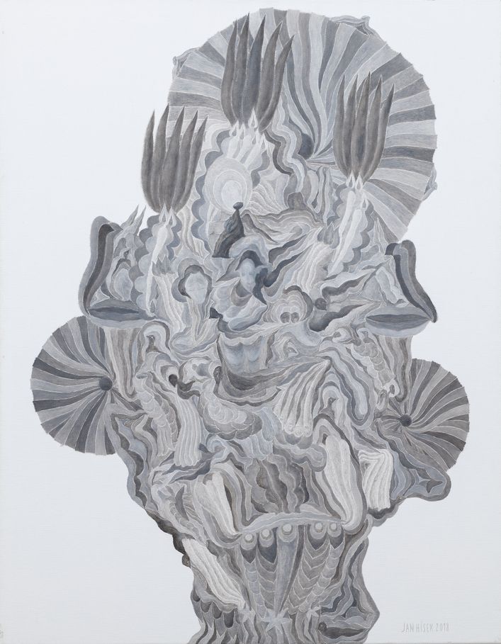 Vyvolávací cena: 100 000 KčObrazTříruká nocvznikl v období, kdy se Hískova malba výrazně přiklonila k sevřenější kompozici a tmavší, téměř monochromní barevnosti, jež předznamenala jeho reflexi existenciálních témat v následujících letech. Centrální motiv díla tvoří organická struktura splývající z vějířovitých lasturových forem, vlnitých tkání a spirálovitých útvarů, které evokují současně botanickou i anatomickou realitu a vytvářejí dojem pohledu do nitra živého organismu. Titul odkazující k trojici rukou směřuje k symbolice plurality a možné alchymistické transformace, přičemž noční temnota zde není pouhou časovou kulisou, nýbrž metaforou skrytých, podvědomých procesů a mystického poznání. Hískova typická metoda vrstvené intuitivní malby, kterou zde uplatňuje s mimořádnou precizností, vychází z jeho grafické minulosti a odráží se v jemné valérové modelaci připomínající techniku mezzotinty. Obrazová struktura se rozvíjí od centrálního tmavého bodu jako meditativní mandala, jejíž ikonografie balancuje mezi organickým růstem a rozpadem. V díle rezonuje odkaz na symbolistické vizionáře, zejména Odilona Redona s jeho enigmatickými hlavami a podivnými květy, avšak Hísek tyto impulzy překládá do osobitého jazyka bez přímé narativnosti. Precizní práce, jíž se obraz vyznačuje, kontrastuje s nejasností zobrazovaného a vytváří napětí mezi viditelným a nevyslovitelným.Tříruká nocpředstavuje zralé dílo umělce, jež dokáže prostřednictvím malby zhmotnit vnitřní stavy mysli a zprostředkovat autentickou, byť obtížně dešifrovatelnou vizuální zkušenost.
