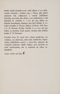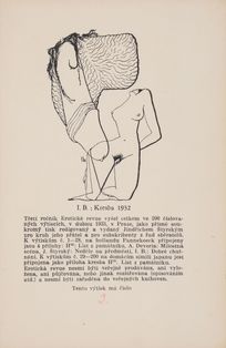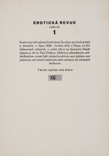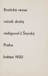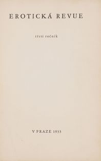 Raritní sběratelskou příležitostí je kompletní vydání slavnéErotické revue, kterou Jindřich Štyrský redigoval pro okruh přátel v Praze mezi říjnem 1930 a dubnem 1933. Tento ikonický projekt české meziválečné avantgardy zůstal širší veřejnosti skryt, protože vycházel v malém nákladu a kvůli cenzuře byl určen výhradně předplatitelům. Na jeho literární i výtvarné podobě se podíleli mimo jiné takoví umělci jako Jindřich Štyrský, Toyen, Adolf Hoffmeister, František Bidlo, Vratislav Hugo Brunner, Emil Filla, Antonín Pelc, Alois Wachsman, ale také Bohuslav Brouk, Vítězslav Nezval, František Halas, Jindřich Hořejší, František Hrubín či Vilém Závada. Vedle textů českých autorů se objevovaly zejména překlady dobových francouzských autorů Louise Aragona, André Bretona, Paula Éluarda a také markýze de Sade. Rozmanitá skladba básní, citátů, kreseb, glos, odborných i pseudoodborných textů, slovníků a provokací činí z Erotické revuesvobodné dílo mladých surrealistů, kteří k erotice přistupovali naprosto otevřeně. Lehkou formu umocňuje nadsázka, neboť texty nejsou myšleny vážně a nesměřují k urážlivé pornografii. Ilustrace zde představují jeden z nejodvážnějších příspěvků české avantgardy k evropské erotické kultuře meziválečného období. Svou otevřeností, vizuální invencí a rafinovaností překračovaly hranice dobové estetiky i morálky.