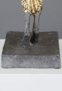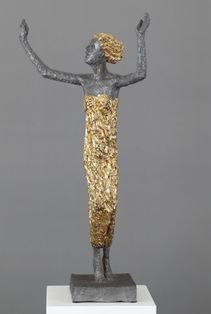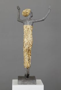 Fascinace vztahem člověka a vesmíru se promítá do díla Olbrama Zoubka s výmluvným názvem Spojení s kosmem . Právě téma lidské existence a univerzálního řádu patřilo k ústředním motivům Zoubkovy tvorby osmdesátých let. Plastika představuje ženskou postavu s pozvednutýma rukama jako symbol inspirace a odpoutání se od země. Kombinace šedé patiny cínu s pozlacenými šaty a vlasy, střídající hrubou strukturu se zlatým plátováním, propojuje fyzickou hmotu s transcendencí a zároveň zdůrazňuje kontrast mezi křehkostí a monumentalitou. Je dokladem autorova mimořádného smyslu pro monumentální gesto a touhu vyjádřit univerzální hodnoty skrze postavu člověka. Představená plastika je třetím ze čtyř modelů pro stejnojmennou velkou sochu z roku 1988, která byla osazena roku 1990 v areálu Českých radiokomunikací na Břevnově. Dílo je uvedeno v katalogu Zoubkovy tvorby (J. Malina: Olbram Zoubek, Brno 1996, kat. č. 630). Při konzultacích posouzeno Nadačním fondem Kmentová Zoubek a PhDr. P. Bregantovou, autorovou dcerou, jejíž certifikát je přiložen.