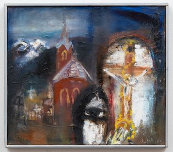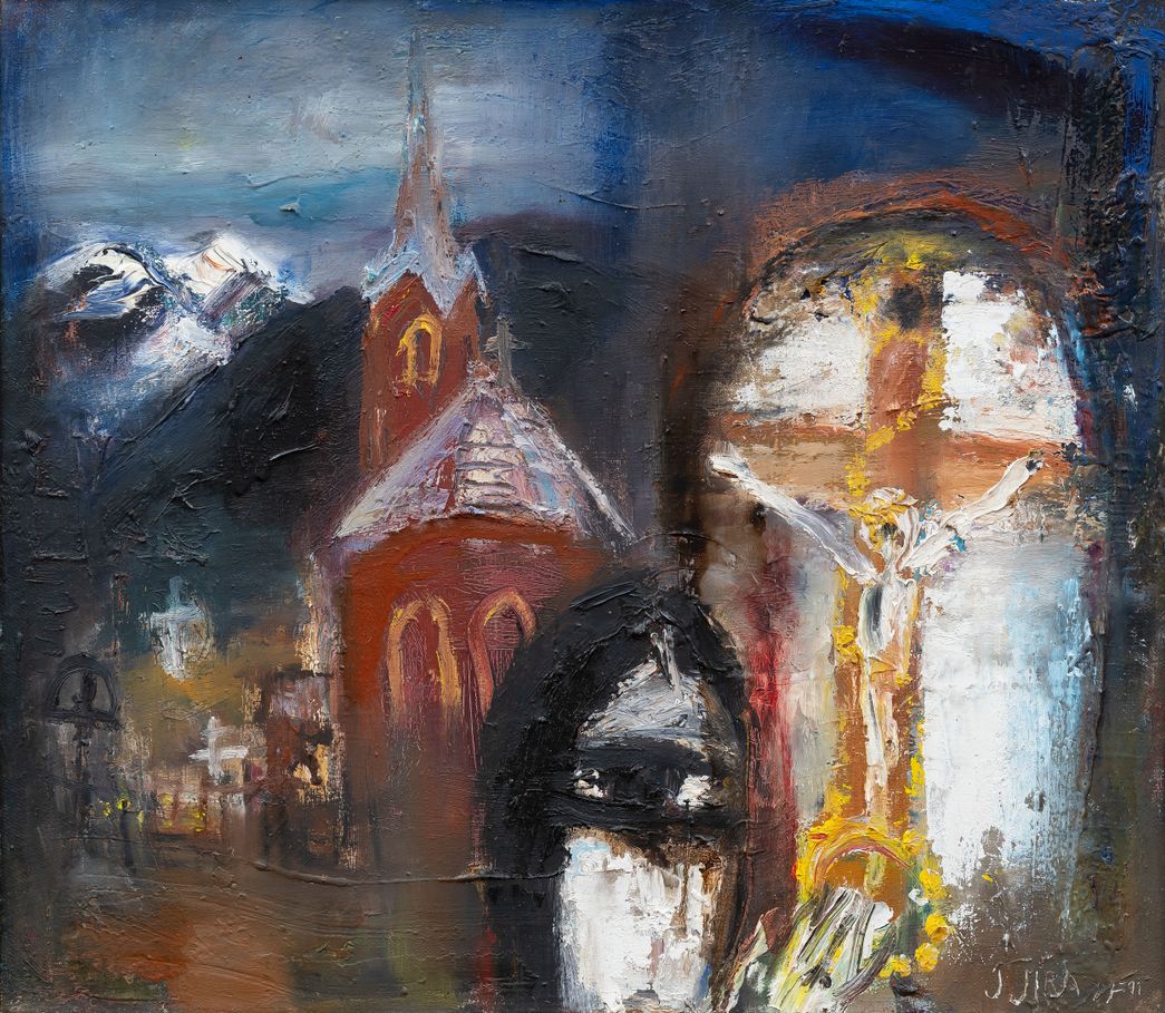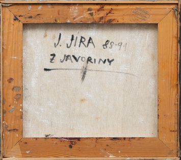 Vyvolávací cena: 60 000 KčObrazZ Javorinypředstavuje silně expresivní malířskou výpověď, v níž se osobní vzpomínka přirozeně spojuje s duchovní symbolikou. Josef Jíra zde ztvárnil kostel sv. Anny v Tatranské Javorině s horskou scenérií v pozadí a výrazným křížem, který dominuje pravé části malby. Barevná hmota je nanášena ve výrazných vrstvách a dramatické kontrasty tónů umocňují napětí mezi duchovním prožitkem a melancholickou náladou. Pro pozdní Jírovu tvorbu je typická emocionální intenzita, energická práce s barvou a využívání motivů víry, smrti a naděje.Z Javorinynení jen krajinářským záznamem, ale i osobní meditací, pamětí a existencí, zobrazenou autorovým charakteristickým rukopisem. Hodnotu díla zvyšuje původní autorský rám. Při konzultacích posouzeno prof. J. Zeminou a Mgr. Z. Štěpanovičovou.