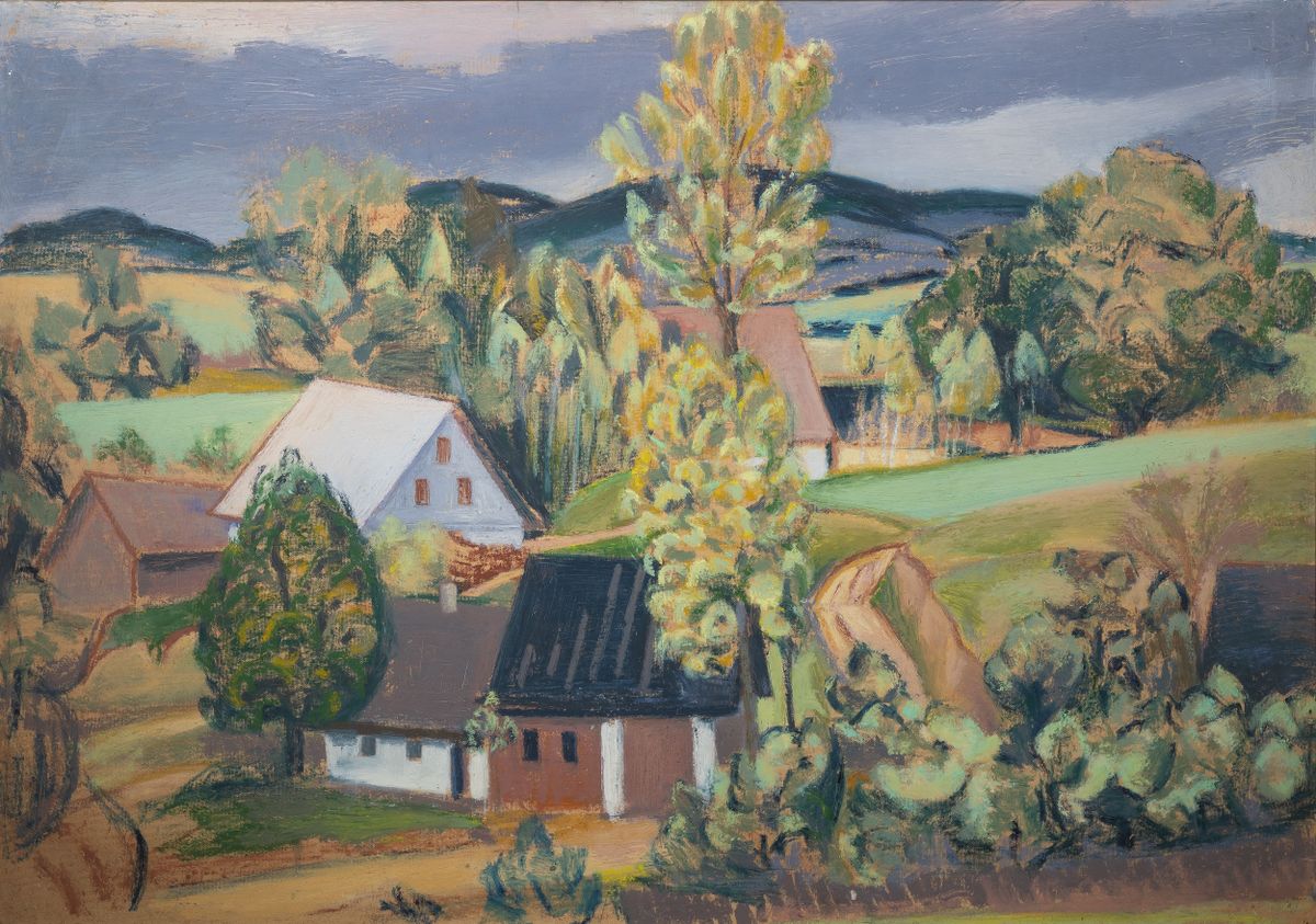 Vyvolávací cena: 70 000 KčV roce 1923 se Jan Trampota trvale usadil v Pěčíně. Krajina v okolí Slatiny nad Zdobnicí, její svahy, stráně, podhorská stavení skrytá pod korunami stromů, se staly jeho tvůrčím útočištěm a nevyčerpatelnou inspirací. Právě zde vznikla díla, která jsou považována za vrchol jeho tvorby. V roce 1928, s tragickou smrtí manželky v Praze, však toto první pěčínské období Jana Trampoty končí. Umělce tehdy postihlo hluboké osamění, přesto právě obrazy z tohoto období, monumentální krajiny s dokonalým zvládnutím výtvarné techniky, představují jeho nejvýznamnější a nejoceňovanější práce.
