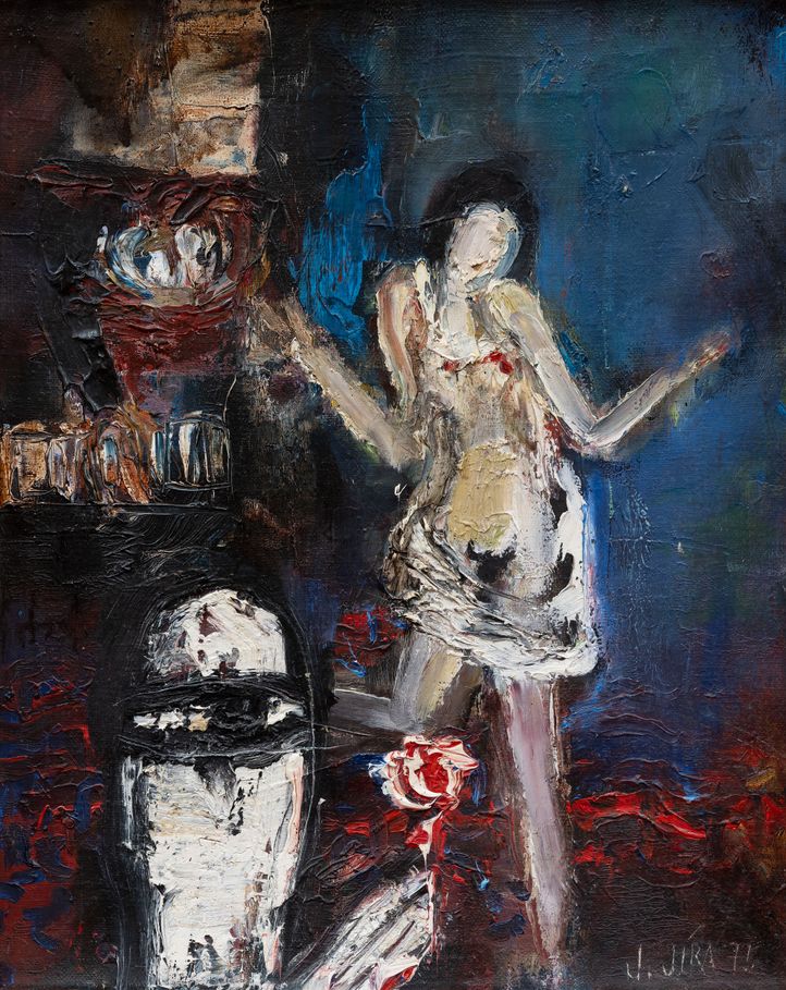 Vyvolávací cena: 60 000 KčJírůvObraz pro malou tanečnicivznikl v době, kdy se malíř intenzivně věnoval portrétu a rozvíjel svůj cyklusOči, započatý v druhé polovině šedesátých let. Kompozici dominuje ženská postava s bílou rouškou volně ovinutou kolem pasu a široce rozepjatými pažemi v dynamickém a svůdném tanečním gestu. V popředí se objevuje charakteristická bílá hlava s jedním okem, jež v tomto výjevu dívce nabízí červenou růži, postava, která reprezentuje malířovu obsesi motivy očí a fragmentů hlav. Změť barev a složitě rozpoznatelných tvarů na pozadí tvoří abstraktní zátiší, které spolu s expresivní fakturou odpovídá umělcově tvorbě sedmdesátých let, pro niž je charakteristické propojení figurace s abstraktními formami, autobiografický charakter a schopnost expresivně zjevovat lidskou osobnost spíše než vnější podobu. Dílo představuje komornější, ale erotičtější variantu podobného obrazu s názvemObraz pro malou Salome(olej na plátně, 1975, 60 × 70 cm, soukromá sbírka), kde se kompozice mírně liší – Salome tančí v levém horním rohu a v popředí po boku jednooké hlavy stojí žena s obnaženými ňadry. Oba náměty tak odkazují k mytickému tanci Salome před Herodem a dokumentují Jírovu fascinaci biblickými příběhy transformovanými do současného výtvarného jazyka. Při konzultacích posouzeno prof. J. Zeminou a Mgr. Z. Štěpanovičovou.