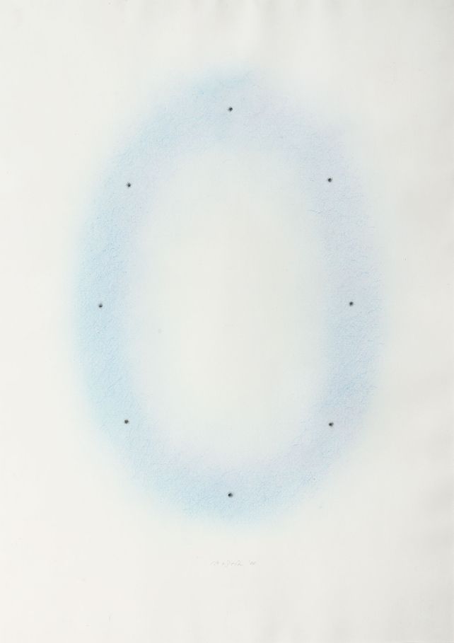 Vyvolávací cena: 150 000 KčElipsový útvar obklopený jemně gradovanými pásy šedomodré barvy s osmi pravidelně rozmístěnými černými body představuje výsledek dlouhodobého Boštíkova úsilí o dematerializaci malířského povrchu a potlačení subjektivního gesta. Technika pastelu umožnila autorovi dosáhnout téměř neviditelné faktury, kde se pigment spojuje s papírem do podoby mlhoviny zbavené hmotnosti. Vertikální orientace elipsy, kterou Boštík v osmdesátých letech preferoval oproti horizontálním členěním předchozího desetiletí, naznačuje posun od krajinných asociací směrem k symbolu transcendence a meditativního vzestupu. Černé body vytvářejí rytmickou strukturu připomínající astronomické konstelace nebo staré kosmologické diagramy, jež Boštíka zajímaly v souvislosti s jeho studiem archaických kultur a raně křesťanské ikonografie. Jemné přechody mezi jednotlivými vrstvami modrofialových tónů dokládají autorovo úsilí o vytvoření prostoru, který působí spíše jako optický fenomén než jako malířská plocha s pevnými hranicemi. Práce reprezentuje pokročilou etapu umělcova zkoumání možností abstraktního obrazu jako meditativního objektu určeného k tichému nazírání. Osmdesátá léta znamenala pro Boštíka období, kdy jeho pastely dosáhly maximální rafinovanosti v roztírání pigmentu, což mu umožnilo realizovat představu o obraze jako energetickém poli, které předchází ztvárněným formám. Dílo vzniklo v době, kdy se stal evropsky uznávaným autorem s výstavami ve Francii a v Německu. Při konzultacích posouzeno prof. J. Zeminou a PhDr. J. Machalickým. Přiložena odborná expertiza PhDr. K. Srpa (cit.:„[…] Pastel rozvádí základní autorovu myšlenku zhmotňování a odhmotňování světla, ke které se blížil od počátku osmdesátých let zejména, když přišel na způsob, jak jemný pastel roztírat po ploše, aby na ní nezůstaly žádné stopy rukopisu. V tomto ohledu se Boštík stal jedním z vůbec nejvýznamnějších zástupců této techniky v evropském umění dvacátého století. […]“).