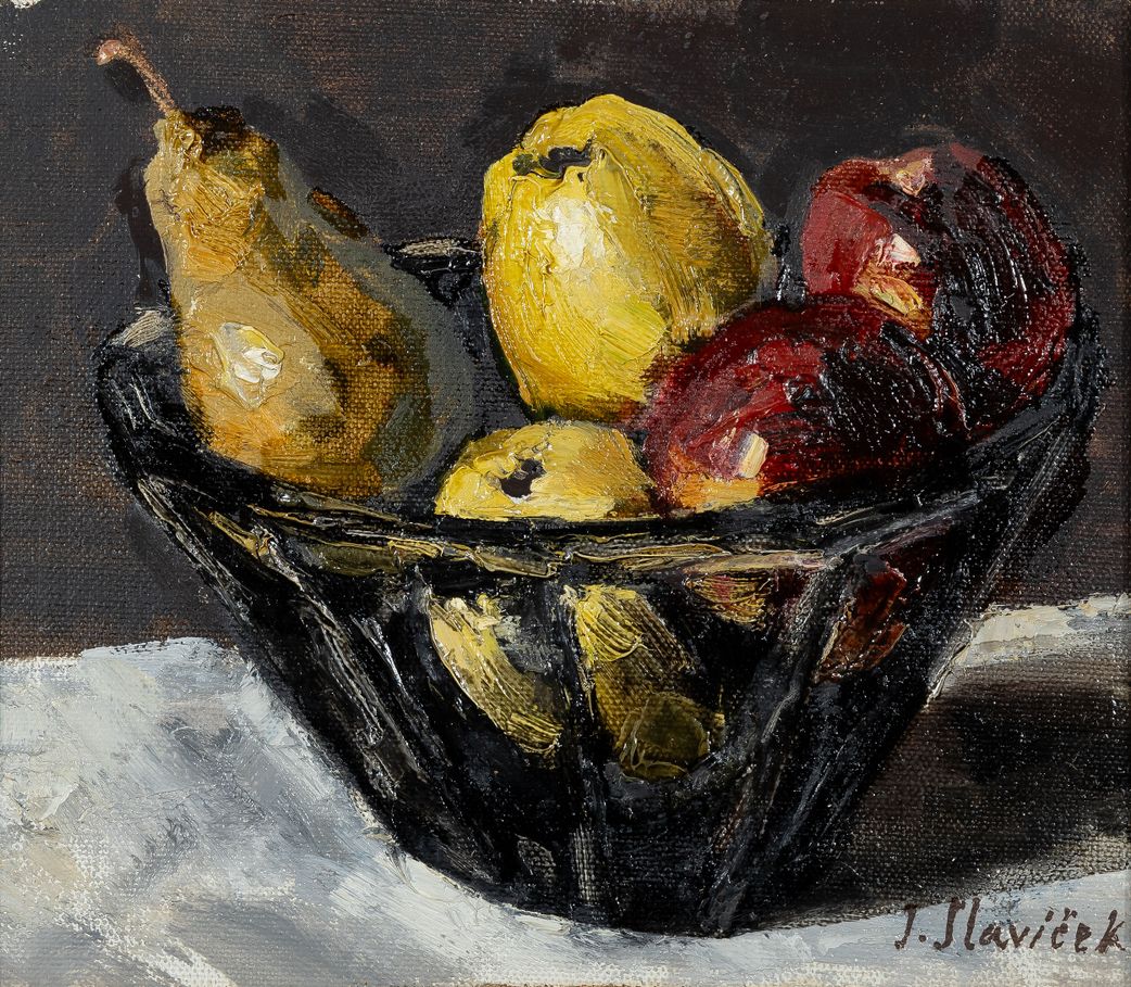 Vyvolávací cena: 35 000 KčKomorní zátiší se skleněnou mísou naplněnou hruškami a jablky na bílém ubruse představuje charakteristickou práci Jana Slavíčka. Autor zde s jemným citem pro barvu a světlo vystihl přirozenou krásu jednoduchého motivu, který zpracoval s důrazem na hutnou barevnost a malířskou pastóznost. Vliv starých mistrů a zejména holandského zátiší nelze přehlédnout v kontrastu temného pozadí se zářivými žlutými a červenými tóny ovoce. Dílo ukazuje Slavíčkův vztah k tradičnímu žánru zátiší, v němž dokázal propůjčit zdánlivě obyčejnému námětu poetický výraz. Prezentováno v původní adjustaci. Při konzultacích posouzeno prof. J. Zeminou a PhDr. J. Machalickým.