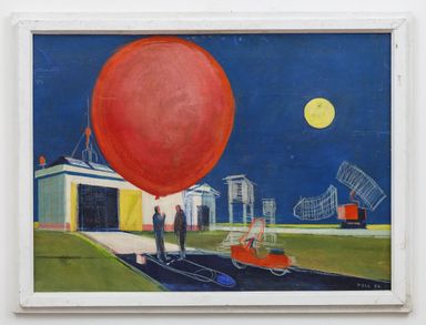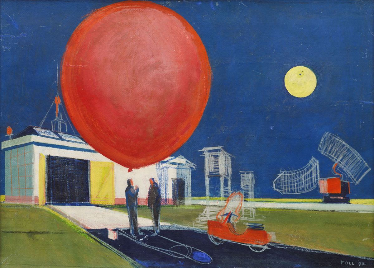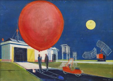 Vyvolávací cena: 70 000 KčPoetické vidění světa se v díle Dobroslava Folla, malíře, grafika a člena skupiny Radar, spojuje s civilizační symbolikou. Foll pracoval často s motivy techniky a architektury, které transformoval do výrazně stylizovaných, barevně kontrastních kompozic. Jeho tvorba se vyznačuje hravostí, smyslem pro groteskní nadsázku i pro vizuální metaforu v duchu nové figurace. Obří balón i jasně zjednodušené tvary v Industriálním motivupřipomínají dětské kresby a zároveň ironizují monumentalitu moderní techniky. Obraz tak ukazuje Follovu schopnost přistupovat k realitě s lehkostí, hravostí a jemně absurdním odstupem. Tím se řadí k originálním postavám českého výtvarného umění druhé poloviny 20. století. Při konzultacích posouzeno prof. J. Zeminou a PhDr. J. Machalickým.