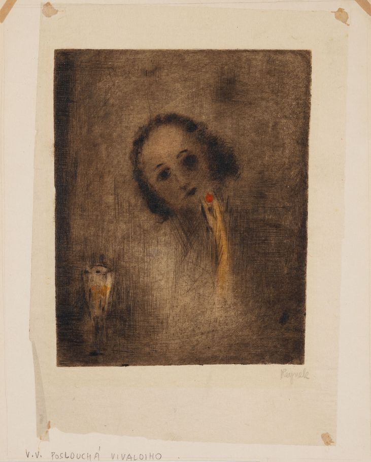 Vyvolávací cena: 60 000 KčV intimním světle svíce se zde rodí okamžik zastavený mezi zvukem a tichem. Postava V.V. (mladá Věra Jirousová, roz. Vařilová, básnířka a historička umění) s nakloněnou hlavou vstřebává Vivaldiho barokní kudrlinky, zatímco jemné vertikální rysky suché jehly evokují vibrace strun. Žluté akcenty monotypu vytváří dvojí světelný zdroj. Jednak reálnou svíci v levém dolním rohu, jednak samotné vyzařování hudby obklopující posluchaččinu tvář éterickým halem. Rok 1965 byl pro Reynka dobou obnoveného kontaktu s mladými umělci po letech izolace. Kombinace grafické přesnosti obličejových rysů s rozostřenou kvalitou pozadí vytváří podobenství o hudbě samotné – o něčem neuchopitelném, co přesto zanechává v posluchači hmatatelnou stopu. Dílo pochází z významné sbírky JUDr. Viléma Trmala a bylo zahrnuto v knize P. Hájek: Výtvarné umění ve sbírce Viléma Trmala, Praha 2021, obr. str. 43. Prezentováno bylo na výstavě (Mám se moc dobře; počasí mi přeje. Lihu však vzal jsem málo, ba i desek. Krásné tisky ve sbírce Viléma Trmala, Galerie KODL, 8.–24. 2. 2023). V soupisu díla Renaty Bernardi (Bohuslav Reynek, Díl 2. Katalog díla, Brno 1992) je uvedeno pod č. G 534. Při konzultacích posouzeno prof. J. Zeminou a R. Vosičkou.