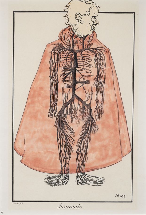 Vyvolávací cena: 25 000 KčAdolf Hoffmeister se věnoval mnoha portrétům významných osobností světové kultury, zejména francouzské a české, které maloval od dvacátých let svým charakteristickým karikaturním stylem. V představené koláži zobrazil s typickou ironií hlavu Maxe Ernsta, předního představitele surrealismu, jako postavu v dlouhém plášti, pod nímž se odhaluje schematicky pojatá „anatomie“, připomínající nervovou soustavu. Kresba osciluje mezi portrétem a metaforou, která uvádí Ernsta jako tvůrce zakořeněného ve fantazii a imaginaci. Práce byla několikrát vystavena (Adolf Hoffmeister: Visages Collages, Galerie Le Minotaure, Paříž, 30. 11. 2006 – 9. 1. 2007; Les avant-gardes tchèques à Paris, Galerie Le Minotaure – Galerie Alain Le Gaillard, Paříž, 29. 5. – 18. 7. 2015). Dílo pochází z autorovy pozůstalosti. Při konzultacích posouzeno prof. J. Zeminou a A. Hoffmeisterem, autorovým synem.