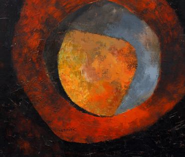Kruhové útvary v červeném a černém poli – na první pohled elementární kompozice, při bližším setkání však obraz, který si klade velké otázky. Janeček tu pracuje s organickými strukturami připomínajícími buňky, embrya, mikrokosmos života samotného, a definitivně se odpoutává od kubistických her a surrealistických narativů své rané tvorby. Barevnost je záměrně redukovaná: červeň funguje jako nositel existenciální energie, zatímco tmavé pozadí vytváří prostor pro kontemplaci. Kruhové formy nejsou jen abstraktními znaky, nýbrž otisky něčeho pradávného, vzpomínkami na původ. V kontextu šedesátých let, kdy se česká malba otevírala světu a zároveň si hledala vlastní hlas, představuje Existence příklad díla, jež nekopíruje západní trendy, ale nachází vlastní cestu mezi konstruktivní kázní a organickým plynutím. Formální přísnost se mísí s meditativním pocitem, že se díváme na něco, co existovalo dávno před námi. Rok 1967 v malířově tvorbě znamená bod zralé sebejistoty – už není třeba experimentovat, stačí naslouchat a zachytit to podstatné. Výjev dýchá klidem, který není lhostejností, ale výsledkem promyšleného soustředění. Obraz byl představen na výstavách (Ota Janeček, Galerie C.A.W. Antverpy, Belgie, 1967, bez kat. č.; Ota Janeček, Východočeská galerie v Pardubicích, září–říjen 1970, kat. č. 64; Ota Janeček: obrazy–sochy, Galerie Fronta, Praha, 1.–29. 10. 1975, kat. č. 14) a je uveden v autorově soupisu díla pod stejným názvem a číslem 10 207. Při konzultacích posouzeno prof. J. Zeminou a Ing. T. Janečkem, autorovým synem. Přiložena odborná expertiza PhDr. J. Machalického.