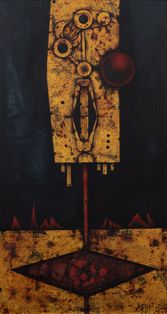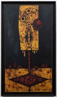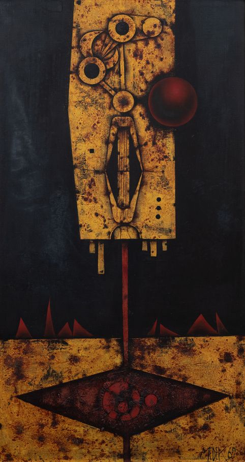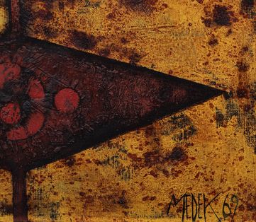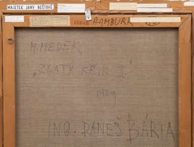 Zlatý křik IIvznikl v rámci krátkého období, kdy byl Medek na vrcholu sil a mezinárodního renomé, ale zároveň v předvečer éry normalizace, která ho odsunula do izolace. Je prostředním ze série tří děl nazvanýchZlatý křik(I z roku 1968,IIa IIIz roku 1969), v nichž autor rozvíjel motiv křiku, který se pro něj stal od roku 1967 klíčovým výrazovým prostředkem. Vertikalita plátna jako by diváka svírala do klaustrofobního pocitu. Zlaté obdélné monstrum složené z husté rozdrásané matérie a mechanických součástí určených k destrukci se rozpíná v temnotě a zapouští se rudým kosodélníkem obsahujícím žhavá ohniska do zlatého podkladu, jako by se otevřela rána do nitra těla. V elementech tvořících tělo křičící entity – zubech, zobácích, ústech, strunách, koulích, buňkách, trnech traumaticky penetrujících hmotu – spatřujeme momenty materiálního zraňování, ale i náznaky sexuální ikonografie a metafory sebetrýzně v podobě tvora požírajícího sebe sama. Medek dosáhl působivé dialektiky mezi vnitřním napětím a vnější destrukcí povrchu. Zlatá tonalita vstupuje do ostré konfrontace s červenými akcenty a mohutnou černí, která vše obklopuje – autor nedělal žádné kompromisy, vše je vyhrocené až na hranu únosnosti. Znovuobjevení tohoto plátna je proto vzácnou příležitostí vidět, jak dokonale ovládal techniku práce s emailem a olejem a jak dokázal osobní traumata přetavit do suverénního výtvarného sdělení. Křik zde již není pouhým výrazem existenciální úzkosti, ale získává nový rozměr předtuchy katastrofy, jež se naplní během normalizačních sedmdesátých let. Technická bravura, s jakou malíř vytvořil plastickou strukturu obrazové plochy, dokumentuje jeho schopnost transformovat traumatické zkušenosti v autonomní uměleckou výpověď.Zlatý křik IItak představuje syntézu Medkova celoživotního zápasu s hmotou malby i s historickými okolnostmi, jež předurčily jeho umělecký osud a byly završeny v cyklechŽíznivých andělůčiPohyblivých hrobů. Dílo bylo prezentováno na výstavách (25. Salon de Mai, 12. 5. – 1. 6. 1969, Salles d‘exposition Wilson, Paříž, kat. č. 132; Mikuláš Medek, Emila Medková, Galerie am Klosterstern, Hamburk, březen 1970; Mikulás Medek, Prag, Kunstkreis Leinfelden, 8.–24. 5. 1970). Pochází z kvalitní české sbírky. Dílo bude zařazeno do chystaného soupisu díla PhDr. E. Kosákové-Medkové. Při konzultacích posouzeno prof. J. Zeminou a PhDr. E. Kosákovou-Medkovou, historičkou umění a autorovou dcerou. Přiložena odborná expertiza PhDr. K. Srpa (cit.„[…] Symetrický ‚Zlatý křik‘ je sumou [Medkových] výrazných motivů, poskládaných vedle sebe, rozvíjených od roku 1967. […] Obraz ‚Zlatý křik II‘ je objevem: dlouhou dobu nebyl nikde vystavován, a diváci mohou sledovat velmi jemné Medkovy vstupy do geometrických obrazců, z nichž nejvíce zaujme levá hrana, která je mírně zkosená, jako by její tvar byl vyvolaný vstupem červené koule. […]“).