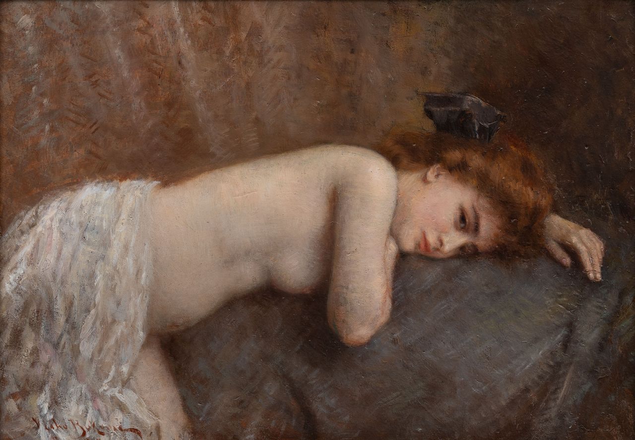 Předkládané plátno představuje typickou a velmi kvalitní ukázku zralého díla významného chorvatského malíře Vlaha Bukovace, jenž se prosadil napříč malířskými žánry od scén náboženských a historických, přes portrét, až po čistý žánr. Ještě než se roku 1903 stal profesorem pražské Akademie výtvarných umění, kde stál u počátků řady progresivních malířů nové generace, prošel v rámci svého školení velký kus světa od USA přes Balkán po Paříž. Zde studoval na slavné École des beaux-arts u ještě slavnějšího Alexandra Cabanela a přátelil se tu také s řadou českých umělců, zvláště s Vojtěchem Hynaisem ho pojilo osobní přátelství – jednalo se tak o osobnost s neoddiskutovatelným mezinárodním rozhledem. Bukovac byl velkým mistrem v malbě aktu, který jeho prostřednictvím vždy získával na smyslnosti a přitažlivosti. Světlo, volba barevné tonality i jakási sametová měkkost, kterou dokázal dívčí tělo prodchnout, tak z jeho aktů vytváří silné zážitky takřka haptických kvalit. Přesně téhož druhu je i toto plátno, v němž se navíc projevuje Bukovacova charakteristická dělená barevná struktura, umocněná nasazením měkkého světla. Smyslnost, či dokonce nepřímá erotičnost výjevu představuje jednoznačně jednu z nejsilnějších kapitol jeho výtvarného portfolia. Při konzultacích posouzeno prof. R. Prahlem, CSc., a prof. M. Rakušanovou, Ph.D. Přiložena odborná expertiza PhDr. Š. Leubnerové.