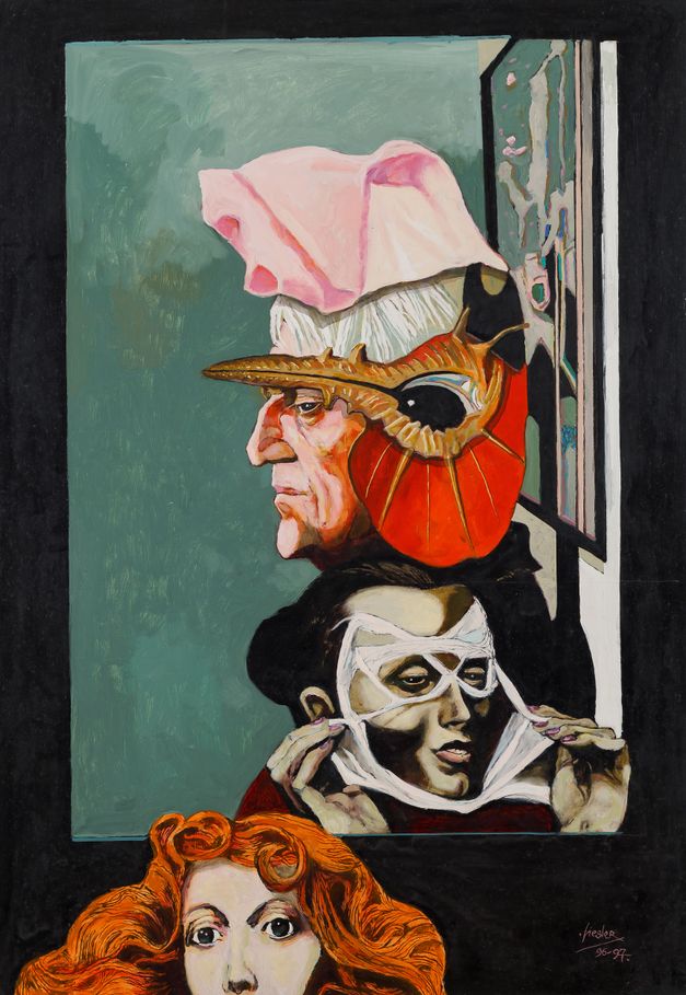 Vyvolávací cena: 280 000 KčHovorový název prozrazuje ironický odstup osmdesátiletého tvůrce, jenž se po dekádách práce s alegoricko-symbolickou metaforou propracoval k jasnější, méně patetické dikci zachovávající surrealistické kořeny vlastní fantazie. Malířská technika umožňující hladké, téměř emailové povrchy připomínající staré mistry zde nese pečeť zkušeného řemesla. Dvě lidské hlavy splývají v bizarní útvar s mohutným ptačím zobákem a velkým, zlověstným okem. Spodní postava, duchem nepřítomná, si z obličeje strhává bílou bandáž, zatímco nad ní bělovlasý muž v zamyšlení hledí ze své pozice u zdi s plátnem někam ven – z okna nebo z roviny samotného obrazu. Růžový předmět, možná mušle, na jeho temeni evokuje něco organického, intimního – symbol zrození, krásy, ale i prázdnoty. Rudovlasá dívka nahlížející zpod spodního okraje plátna nás svým pohledem upozorňuje, že jde o pouhou optickou iluzi a nic z toho není skutečné. Kompozice figur uspořádaných v úzké horizontále, bez vzájemného psychologického propojení, připomíná totem nebo archeologické vrstvy paměti. Každý prvek naskládán na předchozí vytváří dojem nestability a zároveň nutkavého pořádku. „Podivná společnost“ odkazuje spíše k absurdnímu divadlu než k surrealistické metafoře a představuje vzácný doklad pozdního stylu, v němž se zkušenost téměř celého století výtvarných proměn zrcadlí v ironickém, ale nikoli rezignovaném tónu. Dílo bylo vystaveno na autorově samostatné výstavě Mánes Josefu Lieslerovi k 85. narozeninám, Výstavní síň Mánes, Praha, 9. 9. – 5. 10. 1997, bez kat. č. Pochází přímo z rodiny autora. Při konzultacích posouzeno prof. J. Zeminou a PhDr. K. Srpem. Přiložen certifikát autenticity Galerie KODL.Z kladívkové ceny majitel věnuje 25 % na podporu neziskové organizace Centrum Paraple.