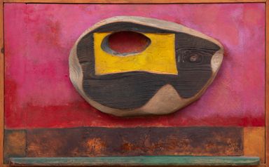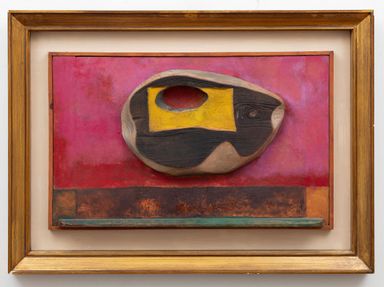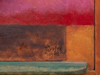 Vyvolávací cena: 60 000 KčDílemPřistání podivného tělesaz roku 1988 Janeček překročil hranice tradičního závěsného obrazu a vytvořil reliéf, v němž se dřevěný vejčitý útvar vynořuje z purpurového pozadí jako část složité trojrozměrné skládačky. Temné nitro tohoto tělesa oživuje žlutý obdélník a další vložený otvor evokuje bdělé oko, zatímco zelená lišta ve spodní části kompozice celou práci zakládá v reálném prostoru. Formy evokující biologické organismy či vesmírná tělesa se tak stávají nositeli tajemného vyprávění o setkání neznámého s pozemským světem. Dílo vzniklo v předrevolučním roce 1988, kdy Janečkova tvorba hledala cesty mezi oficiálně přijatelnou abstrakcí a skrytými odkazy na duchovní zkušenost. Název odkazující k vědeckofantastické poetice probouzí prastaré představy o kontaktu s jiným světem, což odpovídá autorovu dlouhodobému zájmu o filosofické rozměry umění. Precizní řemeslné zpracování zde slouží především jako prostředek k vyjádření složitých významových vztahů mezi realitou a fantazií. Práce představuje zralé období Janečkovy tvorby, v níž se technická dokonalost podřizuje hlubším obsahovým záměrům. Objekt byl prezentován na autorově samostatné výstavě Zasloužilý umělec Ota Janeček: výběr z díla posledních let, Galerie Václava Špály, Praha, 1. 11. – 4. 12. 1988, kat. č. 137. Uvedeno v autorově soupisu díla pod stejným názvem a číslem 10 200. Při konzultacích posouzeno prof. J. Zeminou a Ing. T. Janečkem, autorovým synem. Přiložena odborná expertiza PhDr. J. Machalického.
