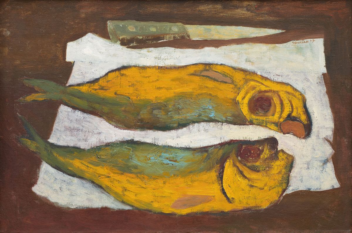 Vyvolávací cena: 50 000 KčVýjimečná ukázka autorovy rané tvorby představuje zátiší s dvojicí ryb položených na bílé utěrce, doplněné o kuchyňský nůž. Dílo pochází z roku 1947, tedy z období, kdy se Janeček po studiích na pražské Akademii výtvarných umění začal osvobozovat od tradiční akademické malby a hledal vlastní výrazový jazyk. Typická je v obraze robustní modelace hmoty spojená s hledáním plastického výrazu, silná, jasně vymezená kontura a zemitě laděné barvy, které předznamenávají umělcovo další koloristické směřování. Přestože je zátiší s rybami ve výtvarném kontextu častým žánrovým motivem, v Janečkově provedení nese expresivní syrovost a introspekci typickou pro české umění druhé poloviny čtyřicátých let. Dílo je uvedeno v autorově soupisu pod číslem 1527. Při konzultacích posouzeno prof. J. Zeminou a Ing. T. Janečkem, autorovým synem.