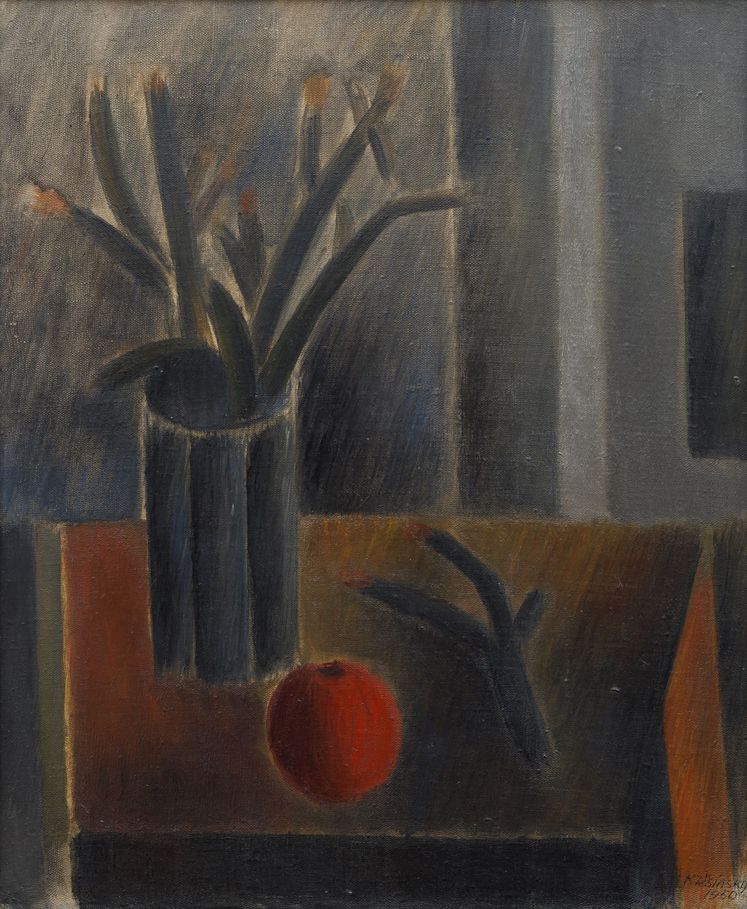 Vyvolávací cena: 30 000 KčKarel Těšínský patří mezi ty umělce, kteří až do nedávné doby stáli pohříchu mimo pozornost širší veřejnosti a odborných kruhů – a to navzdory tomu, že aktivně tvořil po více než půl století a přišel s osobitým a nezaměnitelným stylem. Řadil se k silné generaci výtvarníků, jejichž uvažování stálo v opozici vůči oficiálním tendencím. Studium absolvoval nejprve mezi lety 1948–1951 na Vysoké škole uměleckoprůmyslové v Praze u Františka Muziky, Jana Baucha a Emila Filly. Následně čtyři roky strávil na Akademii výtvarných umění v Praze v krajinářském ateliéru Otakara Nejedlého – vzdělání se mu tedy dostalo v našem kontextu nejkvalitnějšího. Představované zátiší s vázou, květinou a jablkem lze označit za vzácný artefakt svědčící o rané fázi autorova uměleckého vývoje, ve které už ovšem lze rozpoznat nejen možné inspirační zdroje, ale i jeho pozdější směřování. Křehkým malířským rukopisem a abstraktní symbolikou zde navázal na avantgardní meziválečné proudy a zvolené archetypální téma zachytil v odhmotněné, až básnivé kompozici. Dílo tohoto námětu a z této doby se od Karla Těšínského dosud na trhu s uměním neobjevilo a jedná se tak o výjimečnou, možná dokonce neopakovatelnou sběratelskou příležitost. Při konzultacích posouzeno Mgr. M. Dospělem, Ph.D., a PhDr. J. Machalickým.