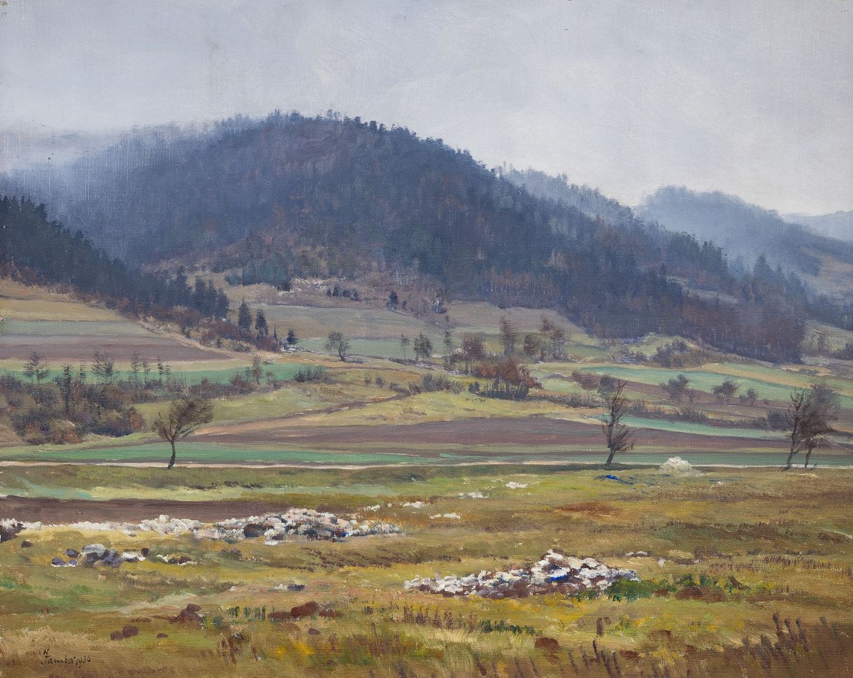 Vyvolávací cena: 40 000 Kč Dosažená cena: 168 000 KčMálokterý text týkající se Josefa Jambora, malíře a grafika, již zralého studenta pražské Akademie výtvarného umění srovnávaného někdy s hlavním objektem svého zájmu s Oldřichem Blažíčkem, vynechá jeho epiteton „malíře Vysočiny“. Svá témata totiž čerpal především na Vysočině. Inspirací mu byla hlavně krajina kolem vsi Blatiny nedaleko Nového Města na Moravě. Českomoravská krabatina u Jambora figurovala jako nejoblíbenější lokace, a to navzdory tomu, že na počátku dvacátých let při svých zahraničních cestách navštívil řadu malebných míst v Jugoslávii, Německu, Holandsku, Itálii či Belgii. Představované plátno zachycuje liduprázdnou krajinu v realistickém, drobnopisném a precizním podání cesty, přírodních detailů, travin, různorodých políček, lesíků a remízků, které je pro autora typické. Obec Borač, jejíž okolí je zde s velkou pravděpodobností zachyceno, se nachází nedaleko Tišnova, kam se Jambor roku 1931 přestěhoval. Při konzultacích posouzeno prof. J. Zeminou a Mgr. M. Dospělem, Ph.D.
