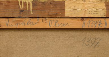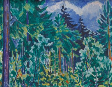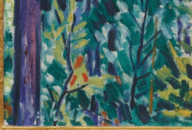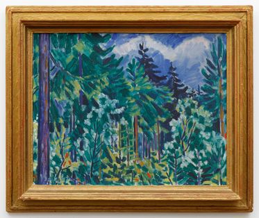 Vyvolávací cena: 1 500 000 KčPředstavovaná působivá krajinomalba Václava Špály zachycuje pohled do nitra vzrostlého jehličnatého lesa v plném letním světle. Vznikla během malířova pobytu v Pyšelích, kam se v letních měsících opakovaně vracel. Ačkoli si jeho válečnou a poválečnou tvorbu spojujeme především s ovocnými a květinovými zátišími, během několika prázdnin zde postupně vytvořil řadu působivých plenérových děl. Kompozice předloženého plátna je otevřena štíhlým kmenem po levém okraji, jenž vertikálně rámuje scénu a zároveň vede divákův pohled k prosvětlené mýtině uprostřed obrazu. Syté, lomené tóny zelené se zde rytmicky střídají s bělobou rozkvetlých keřů a světelnými průniky, které prostupují mezi kmeny až k temnějšímu horizontu. Na pozadí, nad temnou hradbou stromů, se objevuje modrá obloha s tvarově výraznými bílými mraky. Špálův charakteristický, dynamický rukopis nanáší barvy ve výrazných tazích, které se kříží v různých směrech a vytvářejí proměnlivý vizuální rytmus. MalbaV leseje dokladem, že ani ve čtyřicátých letech malíř neslevoval nic ze svého úsilí a jeho malířský projev se vyznačoval uvolněnou barevností a schopností proměnit intimní výsek přírody v silný výtvarný zážitek.
