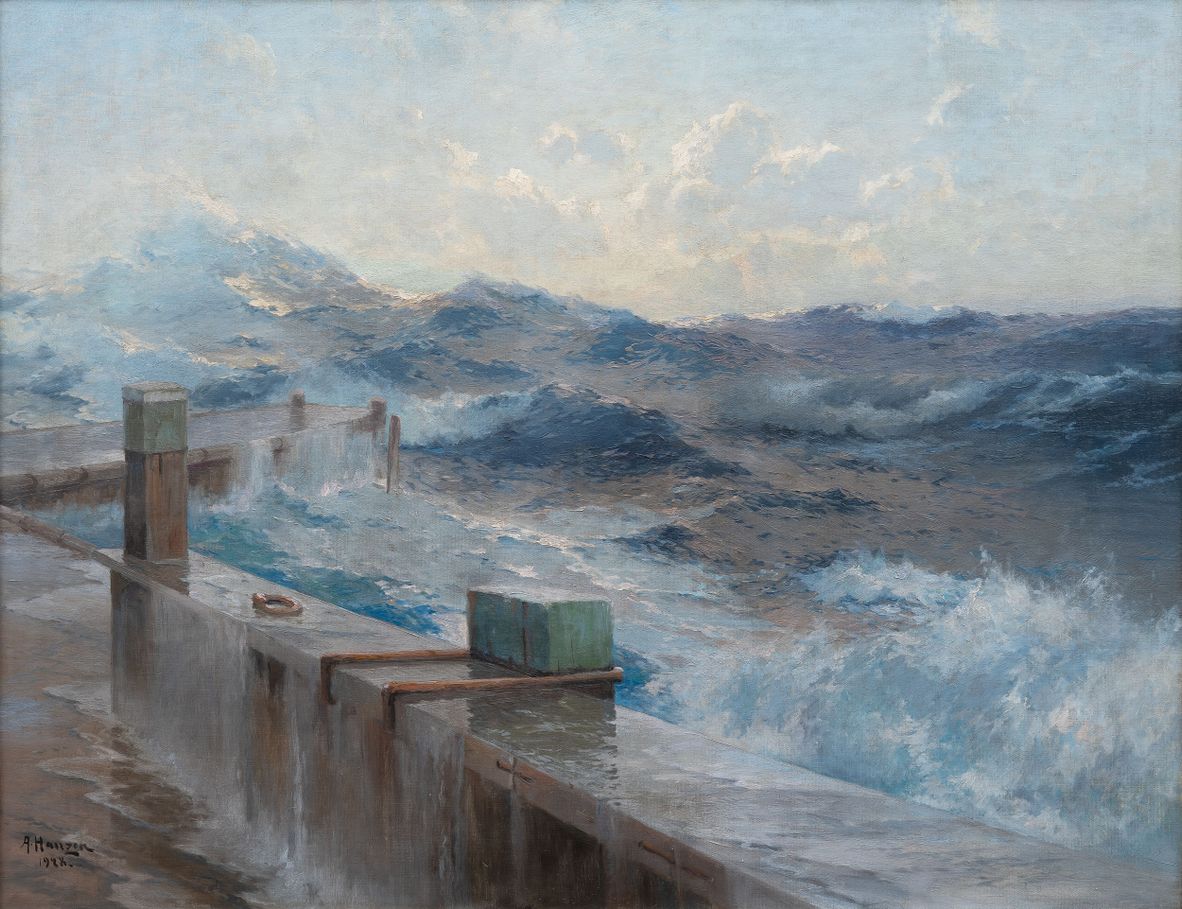 Vyvolávací cena: 150 000 KčPředkládaná ukázka malířského mistrovství a ojedinělé schopnosti věrně vystihnout dynamiku rozbouřené mořské hladiny se nese v autorově charakteristickém stylu a veristické brilanci. Toto rozbouřené mořské nábřeží tak představuje typickou práci Alexeje Vasiljeviče Hanzena, ruského malíře, ilustrátora, grafika, právníka a dvorního umělce cara Mikuláše II. Hanzen byl vnukem věhlasného marinisty Ivana Konstantinoviče Ajvazovského, u nějž také v Petrohradě studoval. Později si rozšířil vzdělání v Drážďanech, Mnichově a Berlíně. Pravidelně vystavoval na pařížských salonech, kde patřil k vyhledávaným umělcům. Jeho primární vášní se stalo moře, což mimo jiné využil při svém angažmá na Ministerstvu námořnictva Ruského impéria. Roku 1920 však emigroval a usadil se na mořském pobřeží v Dubrovníku, kde přesto svůj hlavní předmět zájmu neopustil. Mimo to také hojně vystavoval a Československo dvacátých let nebylo výjimkou. Již během studií si osvojil realismus akademického střihu, jehož prostřednictvím maloval strhující motivy rozbouřených vln a západů slunce, z nichž vždy sálal opravdový a upřímný prožitek. Takovým obrazem je i Příboj, který je pojatý s velkorysostí, citem pro monumentální působení mořského živlu pod nebem s živě zachycenými oblaky. Je zároveň promalovaný s rukopisnou lehkostí i optickou intuicí a je prodchnut doslova haptickým dojmem z vodní tříště a vůně soli. Ve všech svých aspektech tak prokazuje veškeré kvality autorova zralého výtvarného projevu. Při konzultacích posouzeno prof. J. Zeminou a Mgr. M. Dospělem, Ph.D. Přiložena odborná expertiza PhDr. J. Jančárkové, Ph.D.