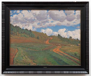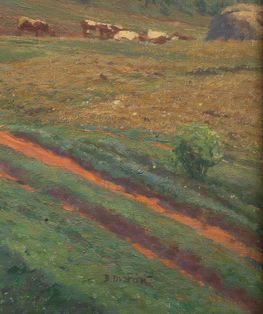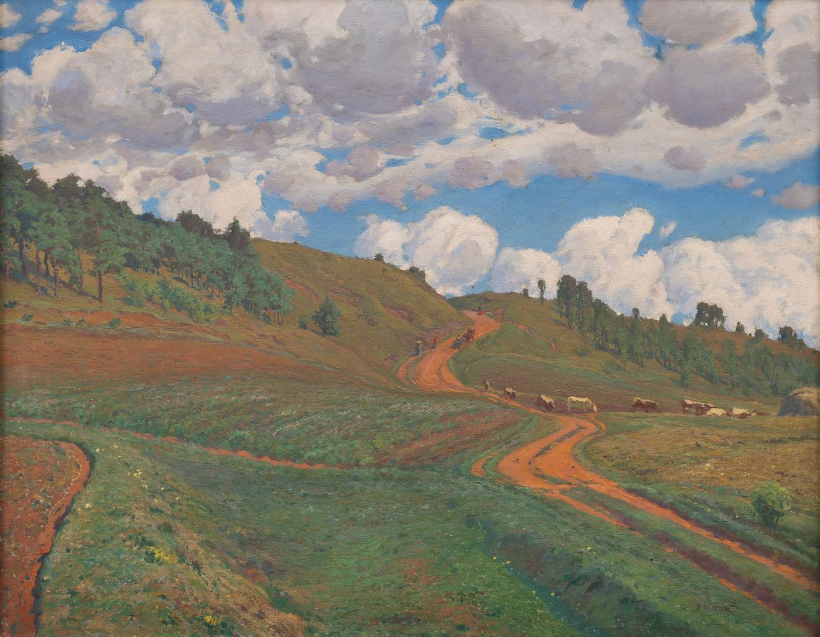 Vyvolávací cena: 40 000 KčToto plátno z paletyBohuslava „Baťky“ Dvořáka je prací již zralého a zkušeného umělce, jenž byl takřka celá devadesátá léta 19. století frekventantem ateliéru Julia Mařáka a přiložil ruku k dílu i při realizaci některých jeho pozdních veřejných zakázek. Setkáváme se zde s velmi optimisticky laděnou momentkou reprezentativního středního formátu, jež je provedena po všech stránkách charakteristickou autorovou výtvarnou polohu. Bezpečně tu rozpoznáváme jeho typické výtvarné finesy, mezi nimi dokonalou modelaci prostoru či drobnopisný fokus zacílený na detail. Krajinný záběr jako by vytrhl z neustále vpřed ubíhajícího časového kontinua, osadil ho pasoucím se stádem krav a drobnými postavami sedláků, čímž vyjádřil pastorální archetyp ideální české krajiny. Dvořák roku 1907 poprvé odjel malovat do Levínské Olešnice u Nové Paky v Podkrkonoší, kde v následujících letech zakoupil i domek. To, že byl představovaný obraz inspirován právě touto lokalitou, dokazuje i barva zeminy, tzv. červené permské půdy, jejíž červený nádech je pro tuto část Podkrkonoší signifikantní. Při konzultacích posouzeno prof. J. Zeminou a Mgr. M. Dospělem, Ph.D.