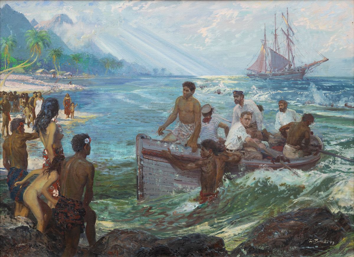 Dramatický výjev přistání evropské posádky u pobřeží tropického ostrova je dílem oblíbeného malíře a ilustrátora Zdeňka Buriana. Jeho práce formovala vizuální představy několika generací čtenářů o exotických krajích, indiánech, námořnících, ale i o pravěku. V předloženém plátně se loďka s námořníky snaží dostat přes rozbouřené moře na břeh, zatímco majestátní plachetnice v pozadí ukotvuje výjev do období námořních objevů a setkání dvou civilizací. Zvědaví domorodci vyzdobeni květinami a oděni do tradičních oděvů se shromažďují na břehu, aby si pozorně prohlédli neobvyklé cestovatele. Palmy, vysoké hory a dramatické světlo prolamující mraky slunečními paprsky dotváří exotickou atmosféru rajského ostrova. Práce pochází z období, kdy se Burian intenzivně věnoval ilustracím dobrodružných románů a výjevům z cestopisné literatury, v nichž vytvářel realistické scény inspirované historickými událostmi, objevnými plavbami a střetem kultur.Vylodění je typickým příkladem jeho schopnosti kombinovat historickou věrnost s epickým patosem. Na jedné straně respektuje reálie – ošacení, výzbroj, lodní konstrukce či etnografické prvky domorodců, na druhé straně klade důraz na napětí, kontrast kultur a sílu přírody. Jedinečná malba je tak obrazem střetu civilizací a dobrodružného ducha objevitelů. Tvoří párový obraz k dílu Návrat z rybolovu. Obě práce Burian namaloval pro svého přítele, kterého v obrazeVyloděnídokonce vyportrétoval a z jehož rodiny dílo pochází. Při konzultacích posouzeno prof. J. Zeminou a R. Walicou. Přiložena odborná expertiza PhDr. J. Machalického.