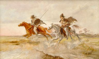 Mikoláš Aleš, one of the most prominent representatives of the so-called generation of the National Theatre, studied at the Prague Academy under the guidance of Josef Matyáš Trenkwald and Jan Sweerts. However, he had to leave school together with Antonín Chittussi in 1876 after the so-called Woltmann affair. He executed this painting entitled The Huns, (also referred to as Riders in older literature), during a difficult period of his life, when a dispute with František Ženíšek culminated over the authorship contribution to the cycle Homeland for the National Theatre. At the same time, his illustrations on the Zelenohorský Manuscript were widely criticised, which led him to retreat to privacy. The subject-matters of the Cossacks, Gypsies, and indigenous tribes served as an escape from reality to him. Similarly, the Huns, although generally considered enemies of cultural civilization, were painted more as bearers of the idea of freedom: the Huns on the presented painting have no purpose, and as Hana Volavková aptly put it: “…they ride and soar on their horses only out of a dizzying feeling of life and the sudden intoxication of freedom…”. Perhaps also due to the overwhelming criticism of his probably most famous work, The Meeting of Jiří of Poděbrady with Matthias Corvinus (1878), Aleš moved away from oil painting to a certain extent and therefore created only a small number of representative oil paintings in his life; he is best known for his unrivalled drawing mastery. The most rare and unprecedented on the art market is The Huns, executed at the end of his oil painting period; his subsequent work developed mainly in drawing and illustration. The ironic addition to Aleš’s painting career is also the fact that the painting did not attract a buyer for a long time. It was even used to cover a broken glass panelling in the door of the artist’s flat, until it was carried away by its first owner. The painting was photographed by Josef Sudek in 1945 and published as part of the project Josef Sudek and Photographic Documentation of Works of Art: From a Private Art Archive to Representing a Cultural Heritage (sudekproject.cz/node/215886). It has also been published and reproduced many times in the literature (Volné směry 1910, XIV, fig. before p. 49, listed as Riders; V. V. Štech / F. X. Jiřík / A. Macek: Mikoláš Aleš, His Life and Work I.–II., Prague 1920, fig. 179; F. Žákavec: On Czech Fine Artists, Prague 1920, p. 96; One Hundred Years of Czech Art 1830–1930, Prague 1930, p. 21, cat. No. 4, repro; Salon XI., 1932, fig. 11, page 9; List of works of the jubilee exhibition Mikoláš Aleš I and II, Prague 1932–1933, small p. 21, No. 19, large p. 27, No. 19, fig. 29; H. Volavková: Oil Paintings of Mikoláš Aleš, Život XIV, 1935–1936, p. 105; Umění 1939–1940, XII, fig. p. 433; A. Matějček: Mikoláš Aleš, 41. vol. of the Prameny edition, Prague 1940, fig. 7; A. Matějček: Mikoláš Aleš, Prague 1940, fig. 7; R. Marek / E. Svoboda: Mikoláš Aleš and Kolín, Prague 1945, p. 102; Czech Art of the 19th century from the Collections of the National Gallery and Prague Castle, Prague 1950, p. 8, cat. No. 8; E. Svoboda: Exhibition of the Works of Mikoláš Aleš 1852–1952, National Gallery in Prague, Prague Castle Riding School, p. 18, cat. No. 249; J. Neumann: Mikoláš Aleš, Prague 1952, p. 27; H. Volavková: Mikoláš Aleš, Paintings, Prague 1954, cat. No. 58, figs. 76 and 77; J. Kotalík: Josef Mánes and Traditions of Czech Art, A. S. Pushkin Museum in Moscow, Leningrad Hermitage and National Gallery in Prague, Moscow 1973, cat. No. 80; H. Volavková: Mikoláš Aleš, Prague 1982, p. 62; P. Šimon: Jindřich Waldes, Prague 2001, pp. 99–100, 126) and exhibited (Moscow – Leningrad 1973, cat. No. 80; Ljubljana 1975, cat. No. 5). The provenance of this work, which was purchased directly from the artist by prof. A. Bouda, is also very interesting. Jindřich Waldes bought it from him for CZK 18,000 in September 1918. Between 1940 and 1998 it was a part of the collections of the National Gallery in Prague (inv. No. O 1838), in 1998 it was restituted and soon after purchased by its current owner. This is a very rare situation where we know the provenance of the work from the artist’s atelier to the present. Based on the aforementioned contexts and facts, The Huns can be considered an absolutely exceptional work of high value for collectors; a work with which the artist ended his painting career and which also has an undeniable art historical significance. Assessed during consultations by prof. R. Prahl, CSc., and prof. J. Zemina. The expertise by PhDr. Š. Leubnerová is attached.