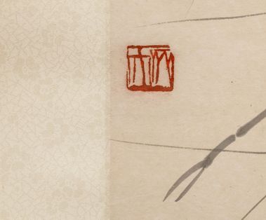 The scroll contains a calligraphic inscription, a typical element in Chinese ink painting. Qi Baishi often accompanied his works with short poems, personal notes, or dedications, and his handwriting was as expressive as the painting itself. The calligraphic inscription could be translated as: “Painted by the Master of the Pavilion of Poetry from the Borrowed Mountain, Qi Baishi.” This poetic pseudonym was used by the artist to reference the period when he “borrowed” a mountain as a refuge for his studio, and expresses humility and deep communion with nature. “Baishi” means “White Stone,” which was the artistic name he received from his teacher and under which he is known around the world. His 1928 work, A Trio of Squirrels and Grapes (inv. no. VM 5680), held by the National Gallery in Prague, contains the same seal. The calligraphic inscription, completed with a red seal, not only confirms authorship but also references the author’s life philosophy, which links the simplicity of the everyday world with the spiritual depth of traditional Chinese culture.